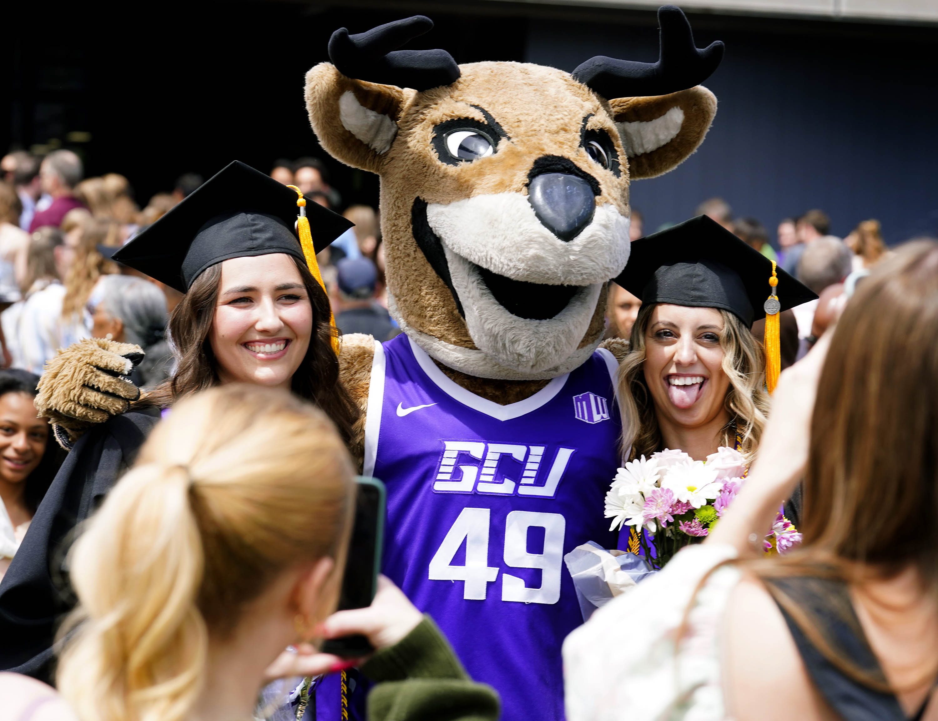 Graduates get their photos taken with Thunder following the Thursday morning commencement ceremony at Global Credit Union Arena on April 23, 2026. -