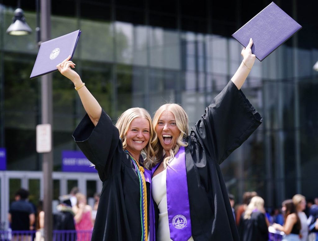 Graduates celebrate on the Quad following the Thursday morning commencement ceremony at Global Credit Union Arena on April 23, 2026.