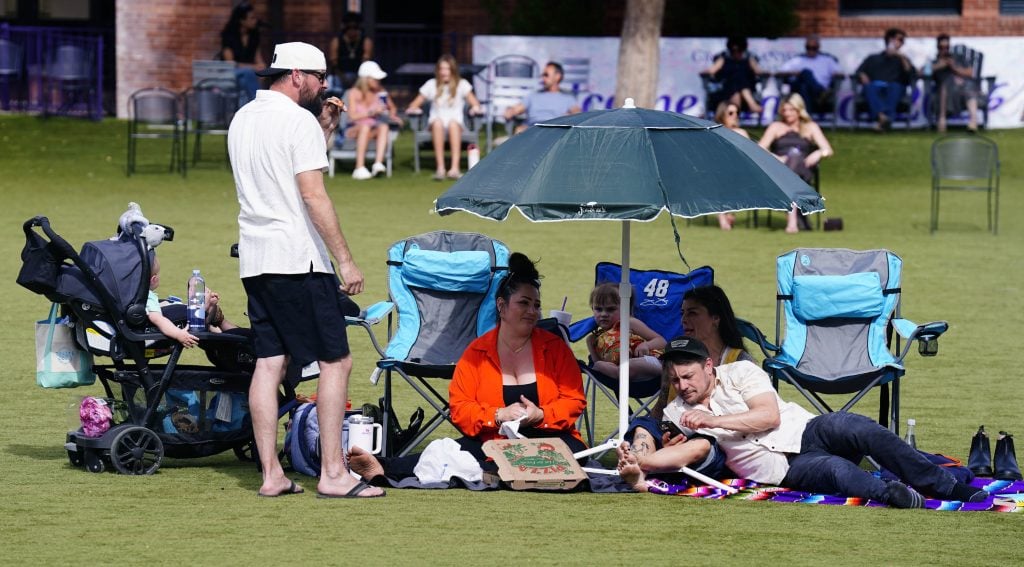 Family members find a spot on the Quad to set up camp to view Thursday afternoon’s commencement ceremony on the large video screen. April 23, 2026. -