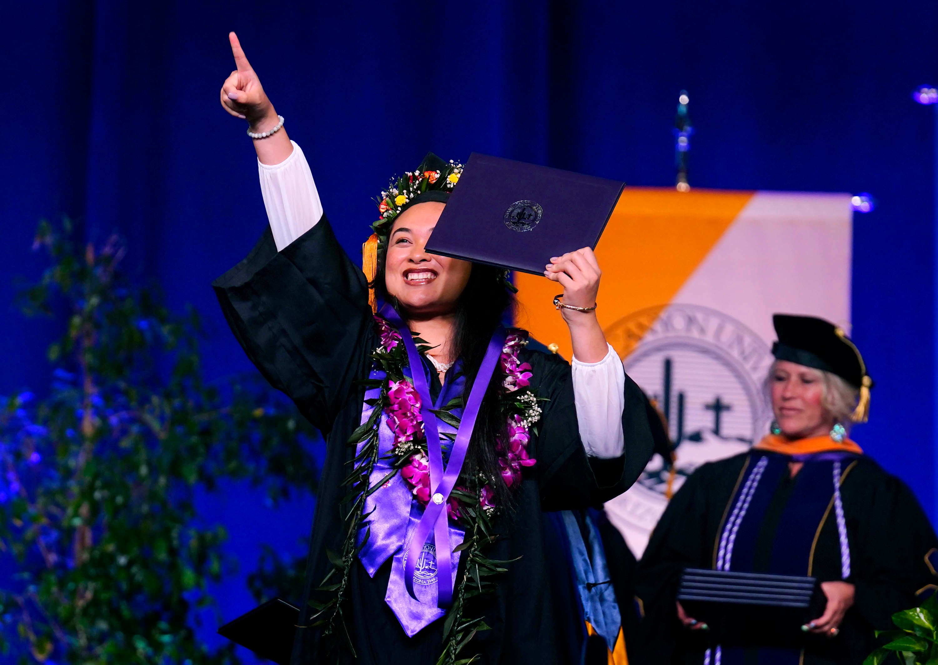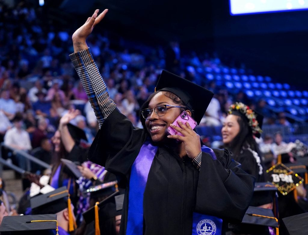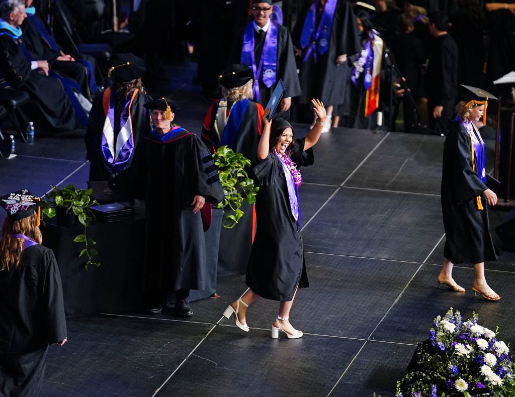 A graduate waves to friends and family in the crowd during the Thursday afternoon commencement ceremony for students in the College of Nursing and Health Care Professions at Global Credit Union Arena on April 23, 2026. -