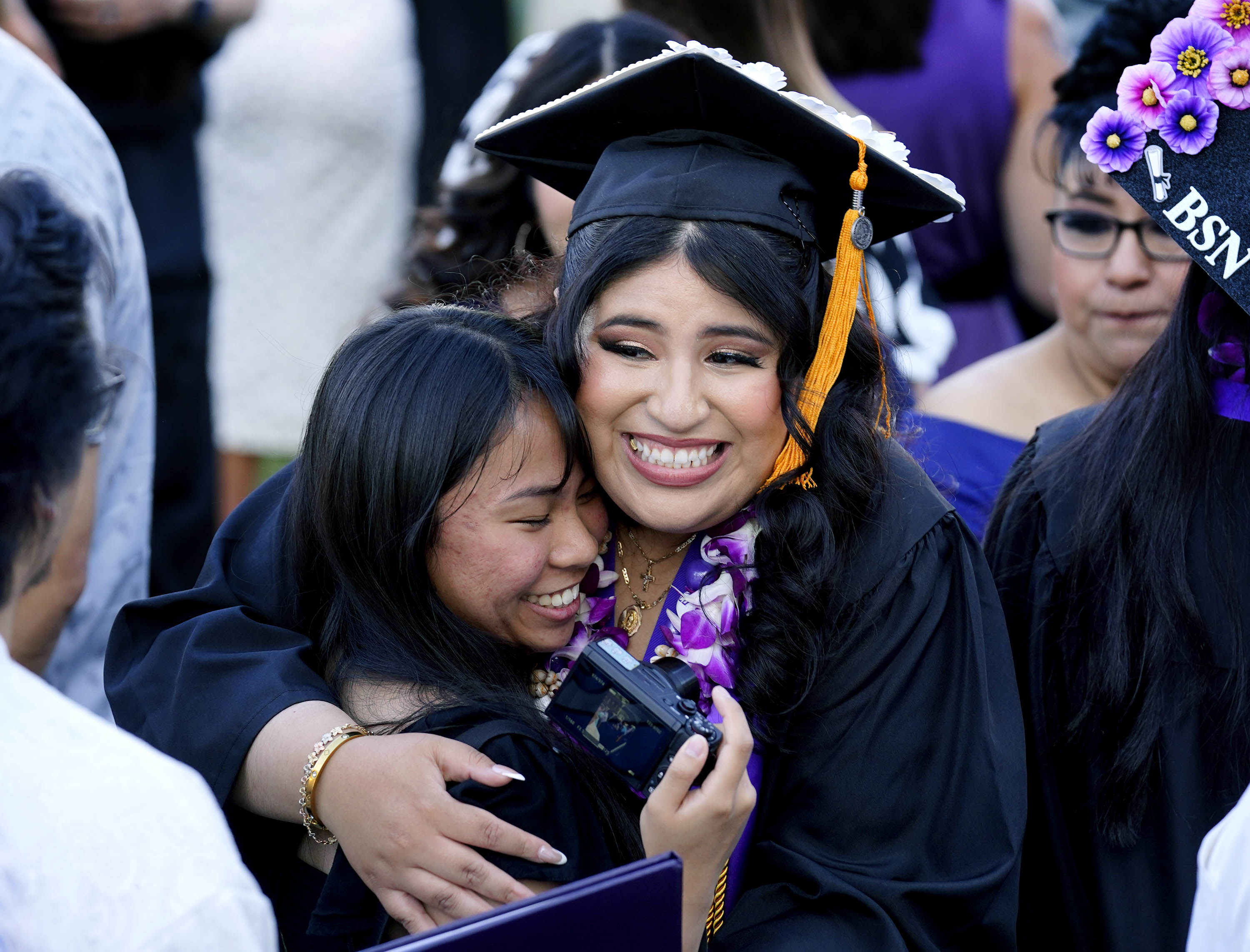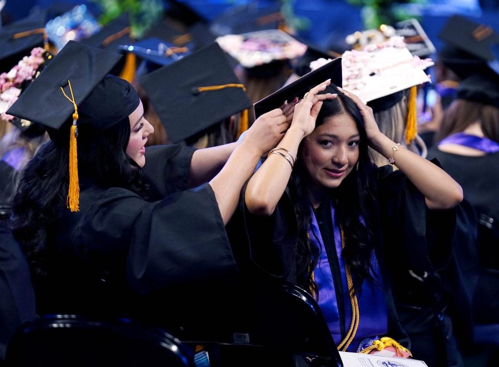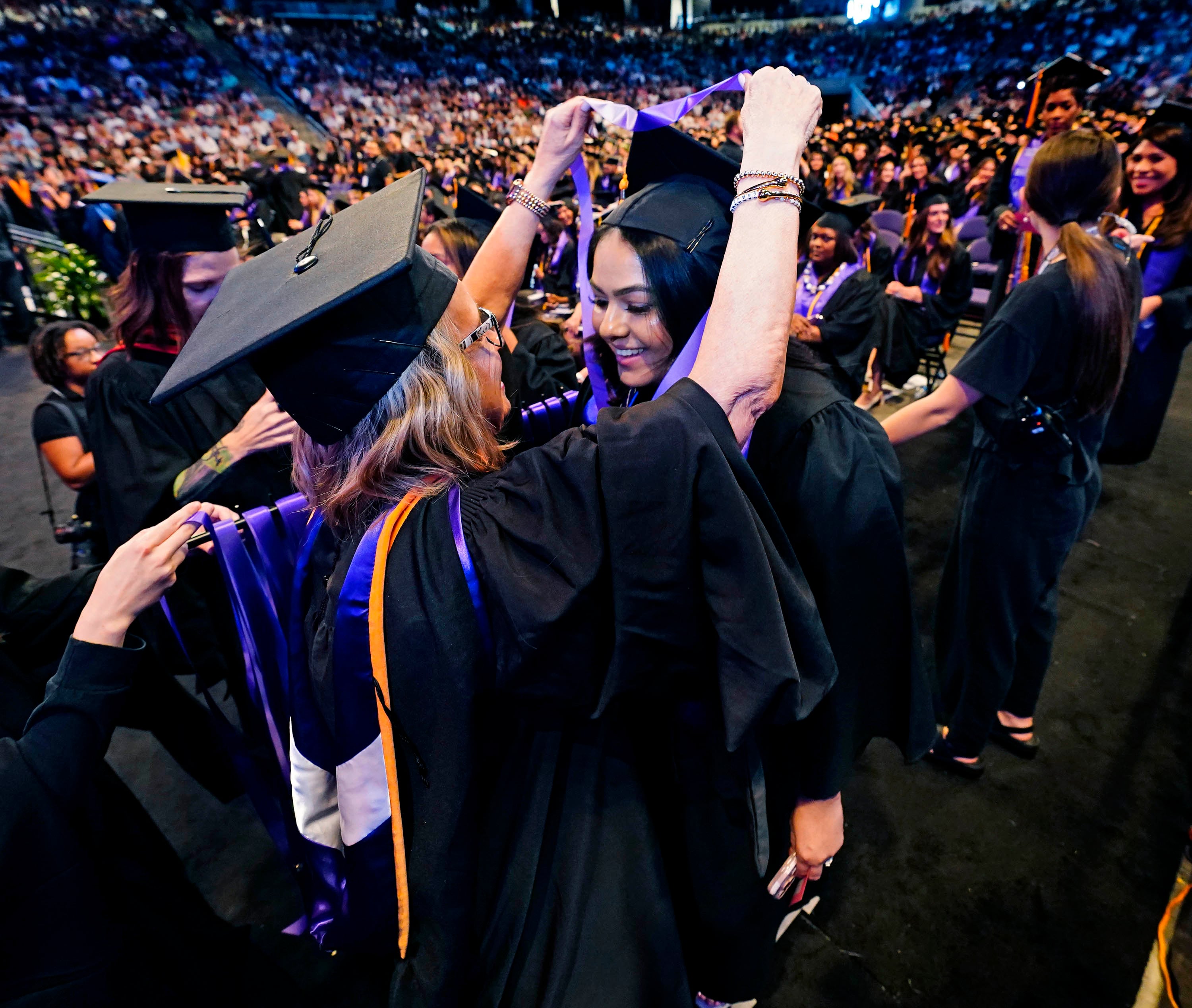 Graduates help each other make last-minute adjustments to their caps and gowns during the Thursday afternoon commencement ceremony for students in the College of Nursing and Health Care Professions at Global Credit Union Arena on April 23, 2026. -
