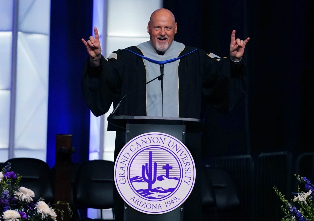 Dr. Paul Danuser, who teaches in the College of Education, gives a Lopes Up to the graduates as he announces the ceremony is about to begin during the Thursday afternoon commencement ceremony at Global Credit Union Arena on April 23, 2026. -
