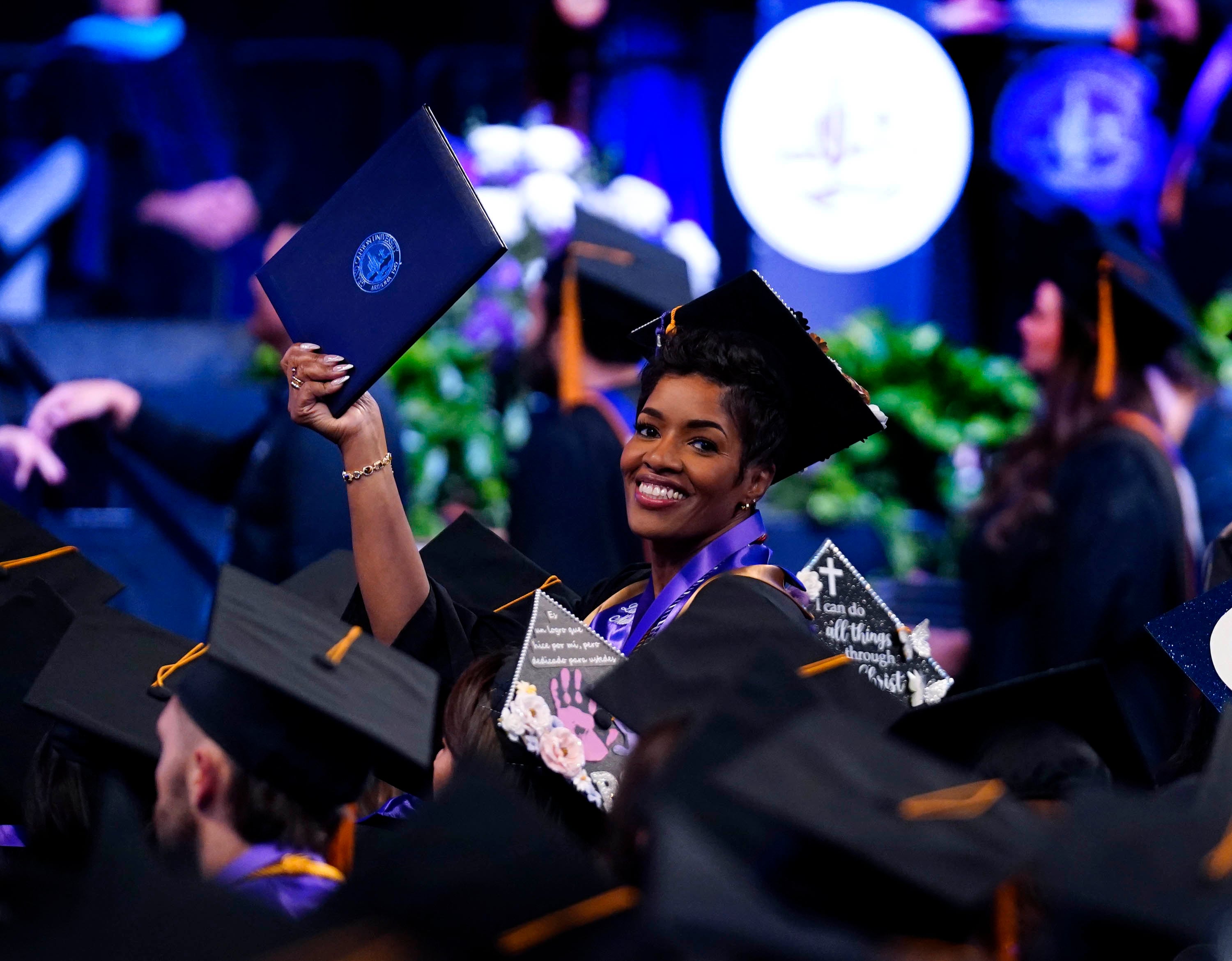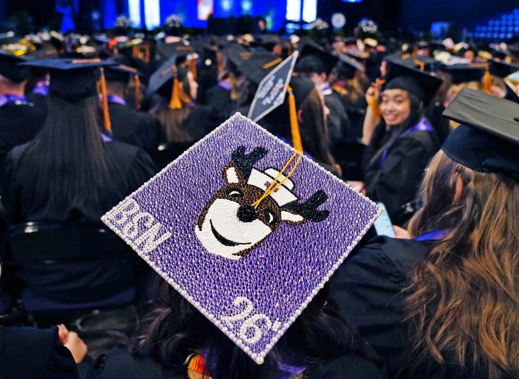 A nursing graduate dons her decorated mortarboard during the Thursday afternoon commencement ceremony for students in the College of Nursing and Health Care Professions at Global Credit Union Arena on April 23, 2026. -