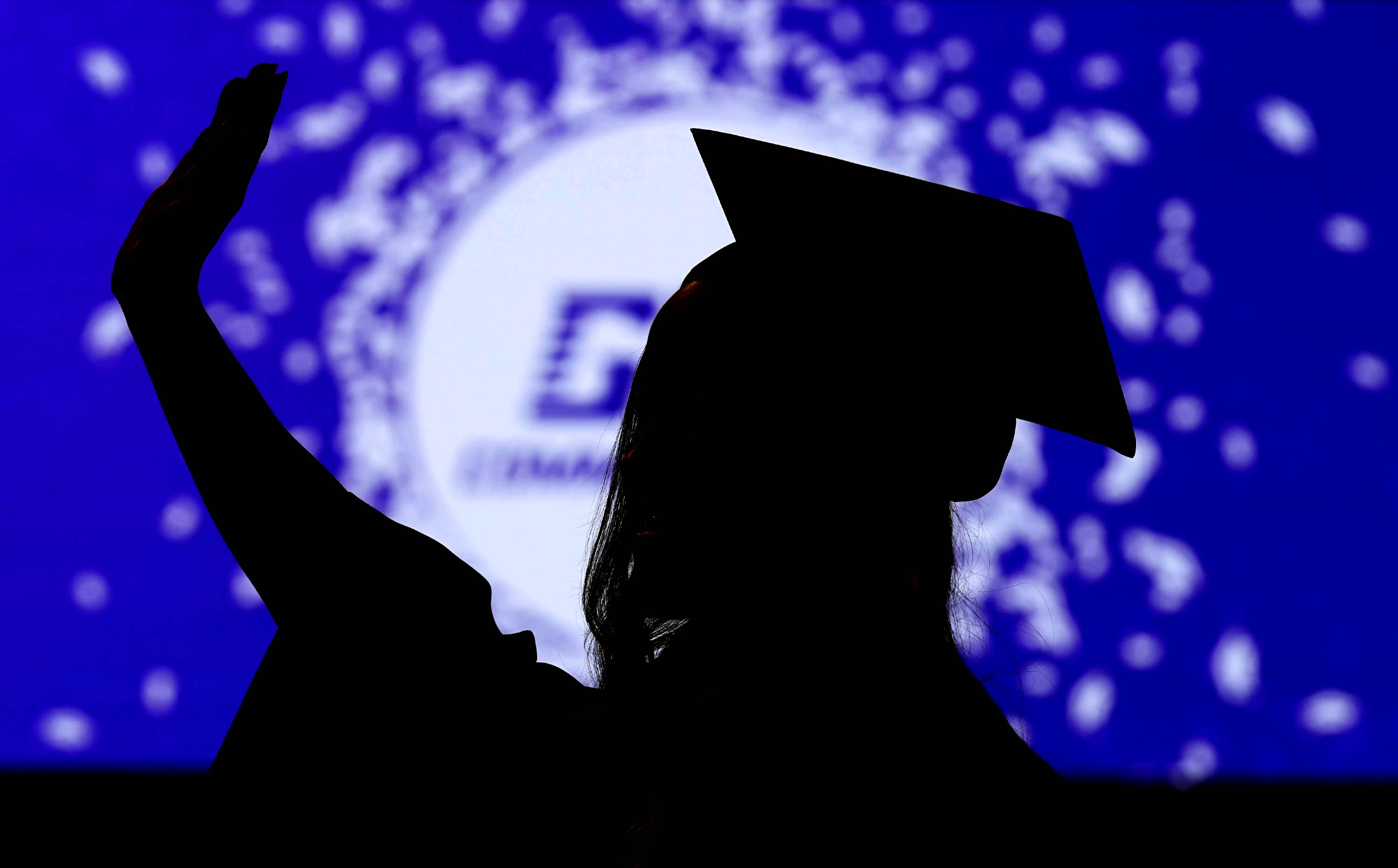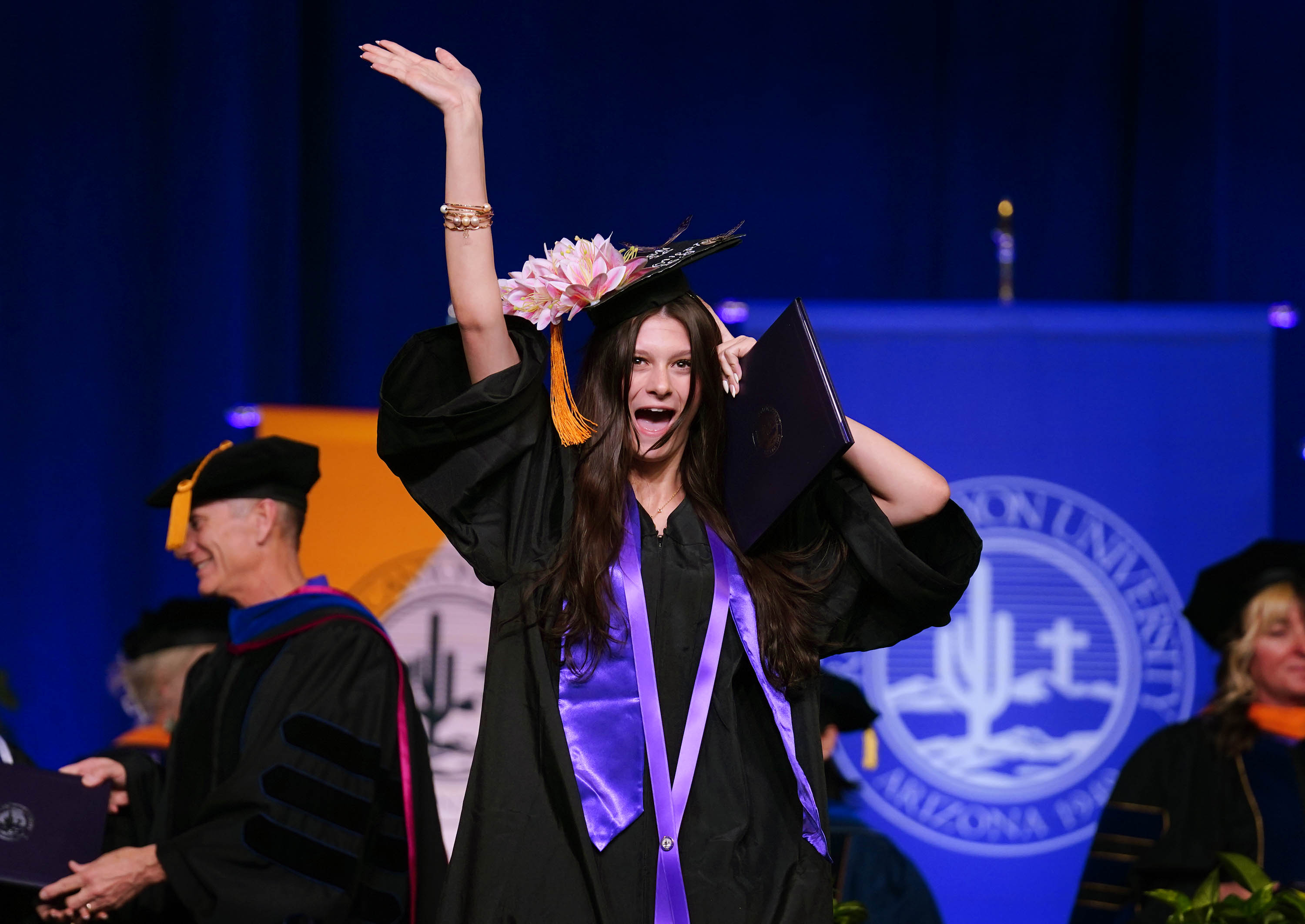 A graduate holds on to her cap as she waves to family and friends in the crowd during the Thursday afternoon commencement ceremony at Global Credit Union Arena on April 23, 2026. -