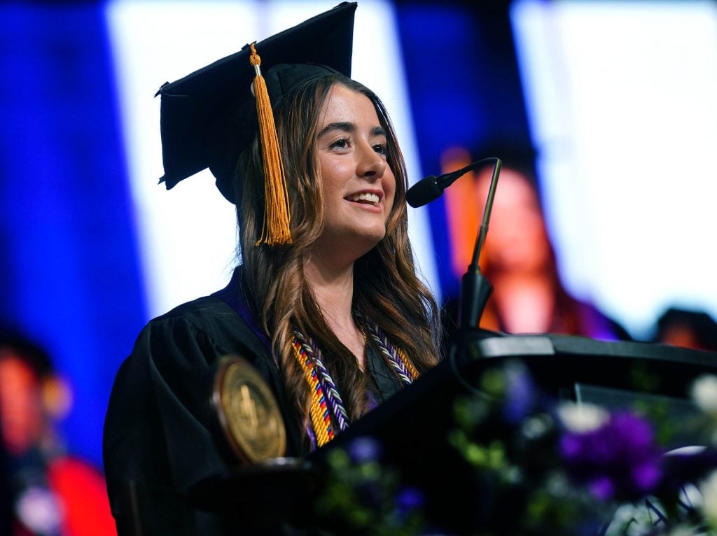 Student speaker Ella Murphy addresses her fellow graduates during the Thursday afternoon commencement ceremony at Global Credit Union Arena on April 23, 2026. -