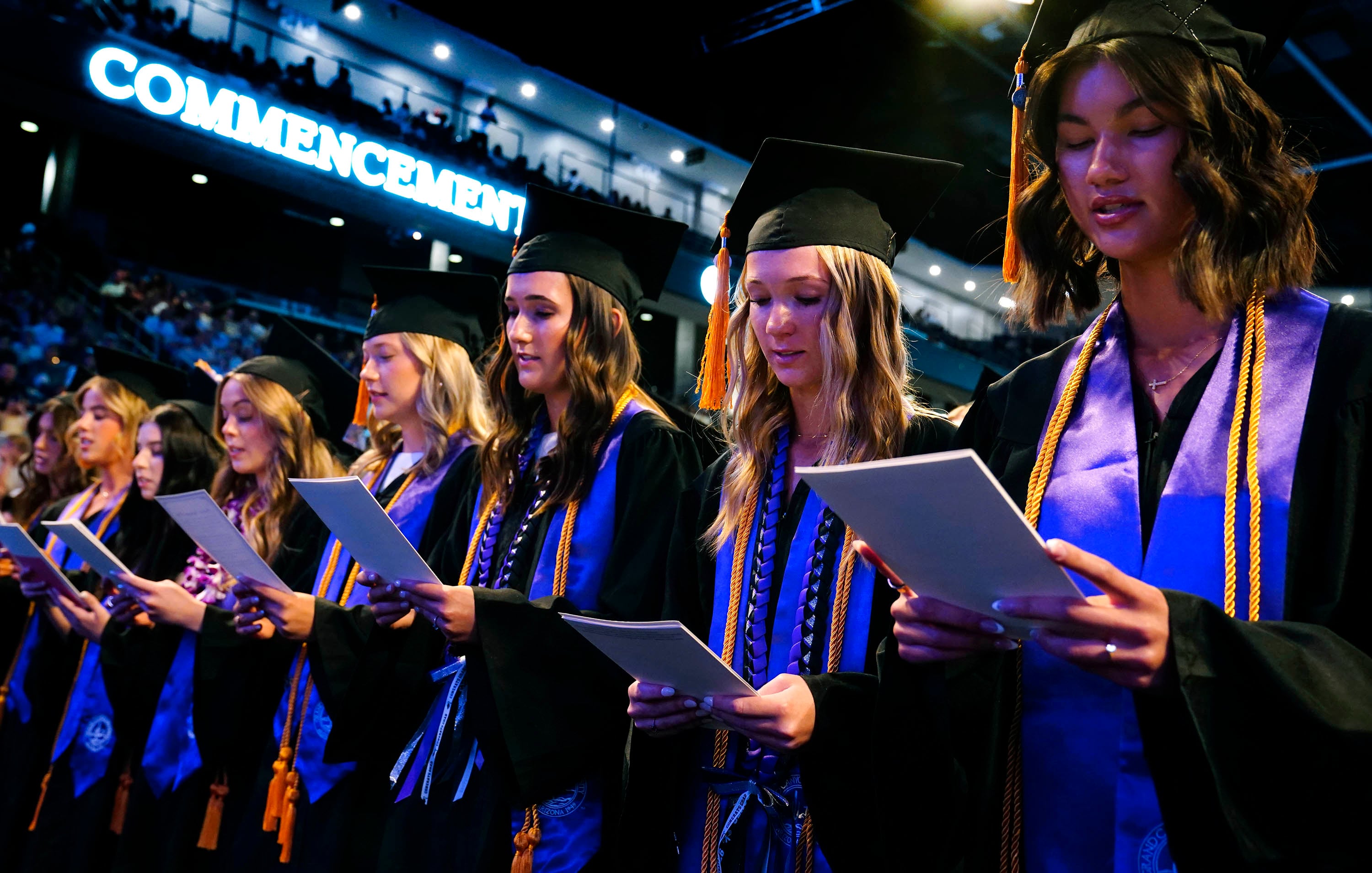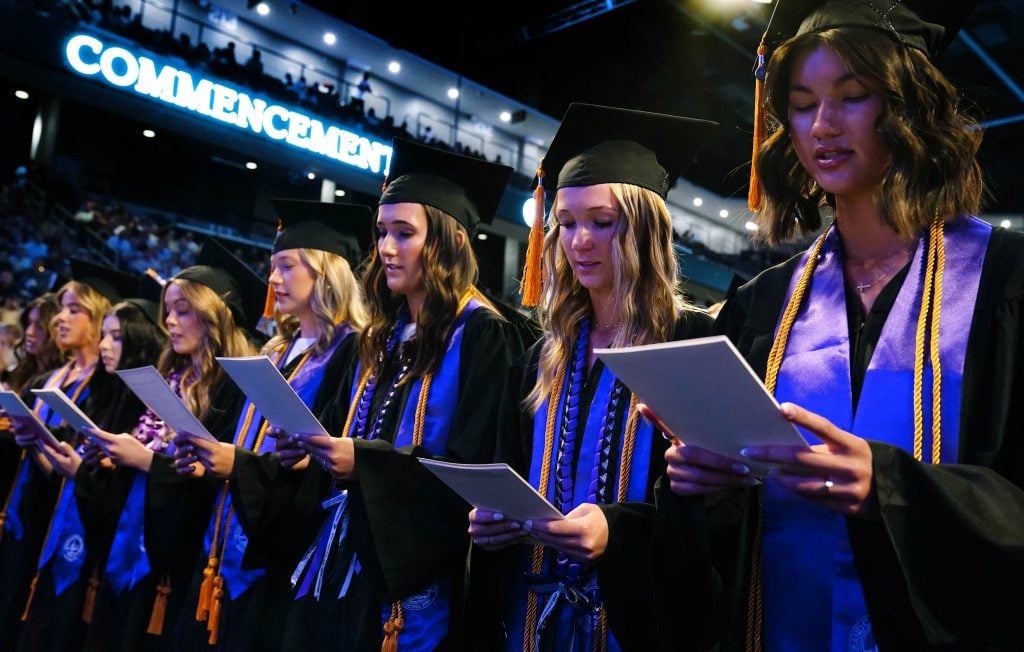 Nursing graduates recite the Florence Nightingale Pledge during the Thursday afternoon commencement ceremony at Global Credit Union Arena on April 23, 2026. -