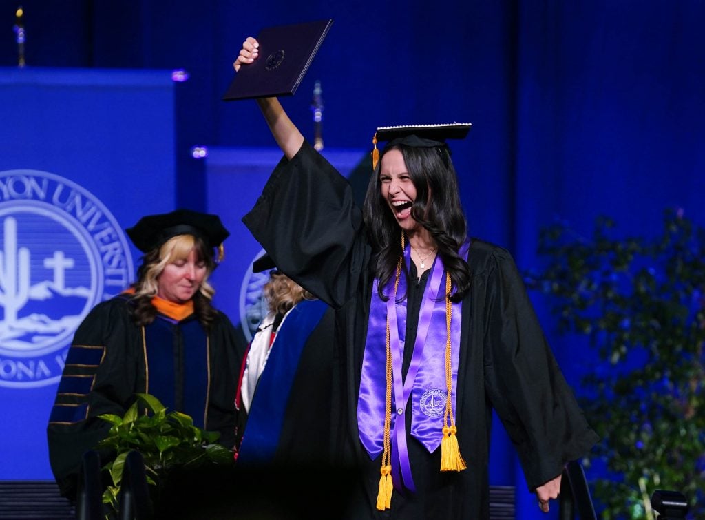 A graduate celebrates after receiving her diploma during the Thursday afternoon commencement ceremony at Global Credit Union Arena on April 23, 2026. -