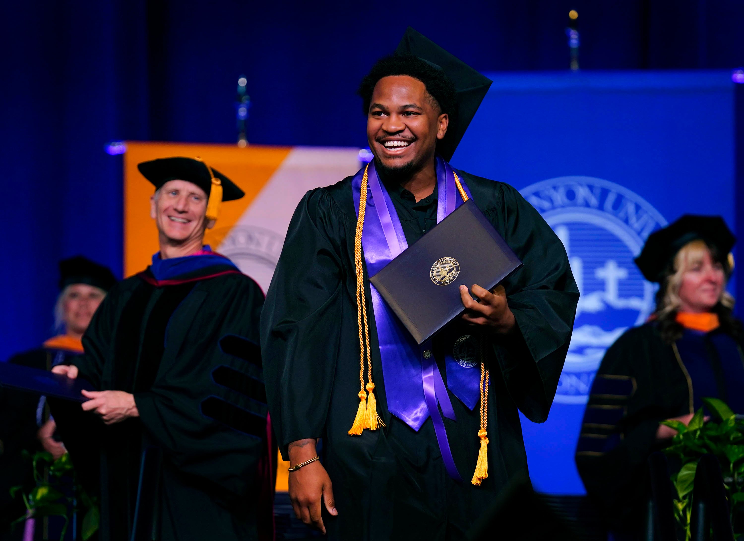 A graduate displays his diploma as he walks across the stage during the Thursday afternoon commencement ceremony at Global Credit Union Arena on April 23, 2026. -