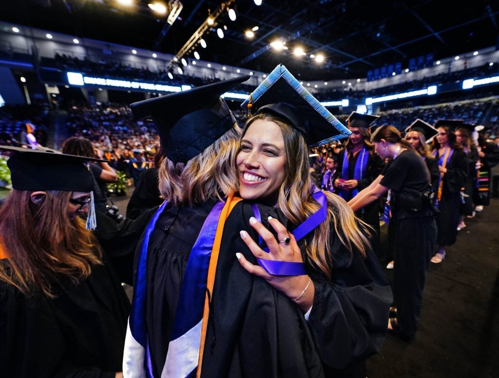 A nursing graduate hugs a faculty member after being pinned during the Thursday afternoon commencement ceremony at Global Credit Union Arena on April 23, 2026. -
