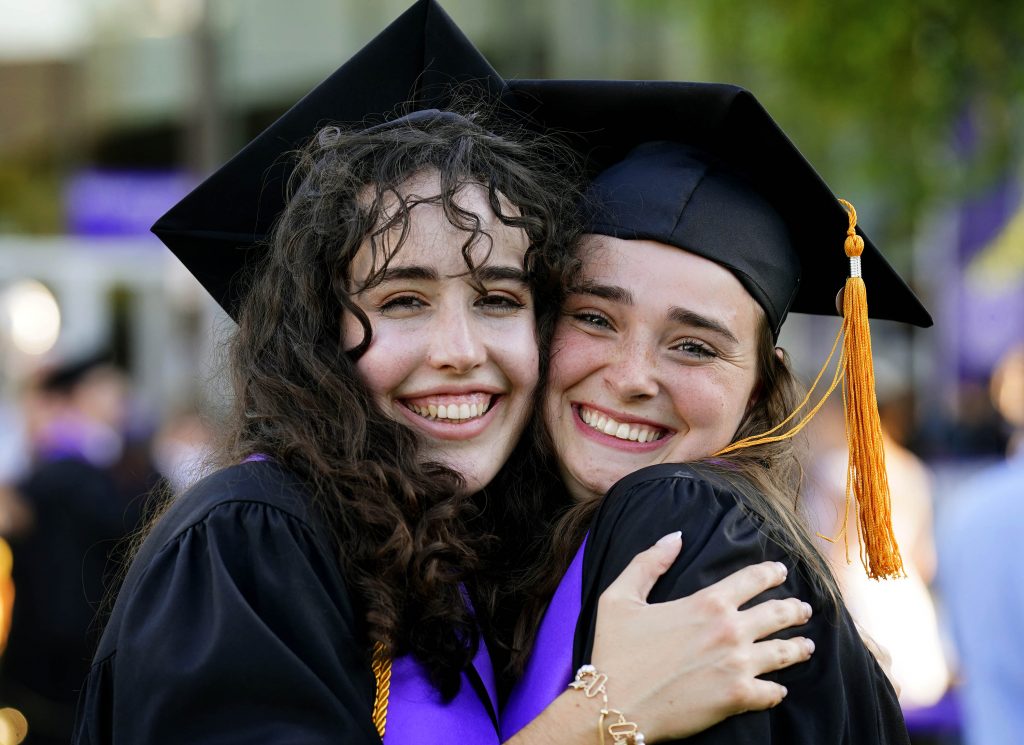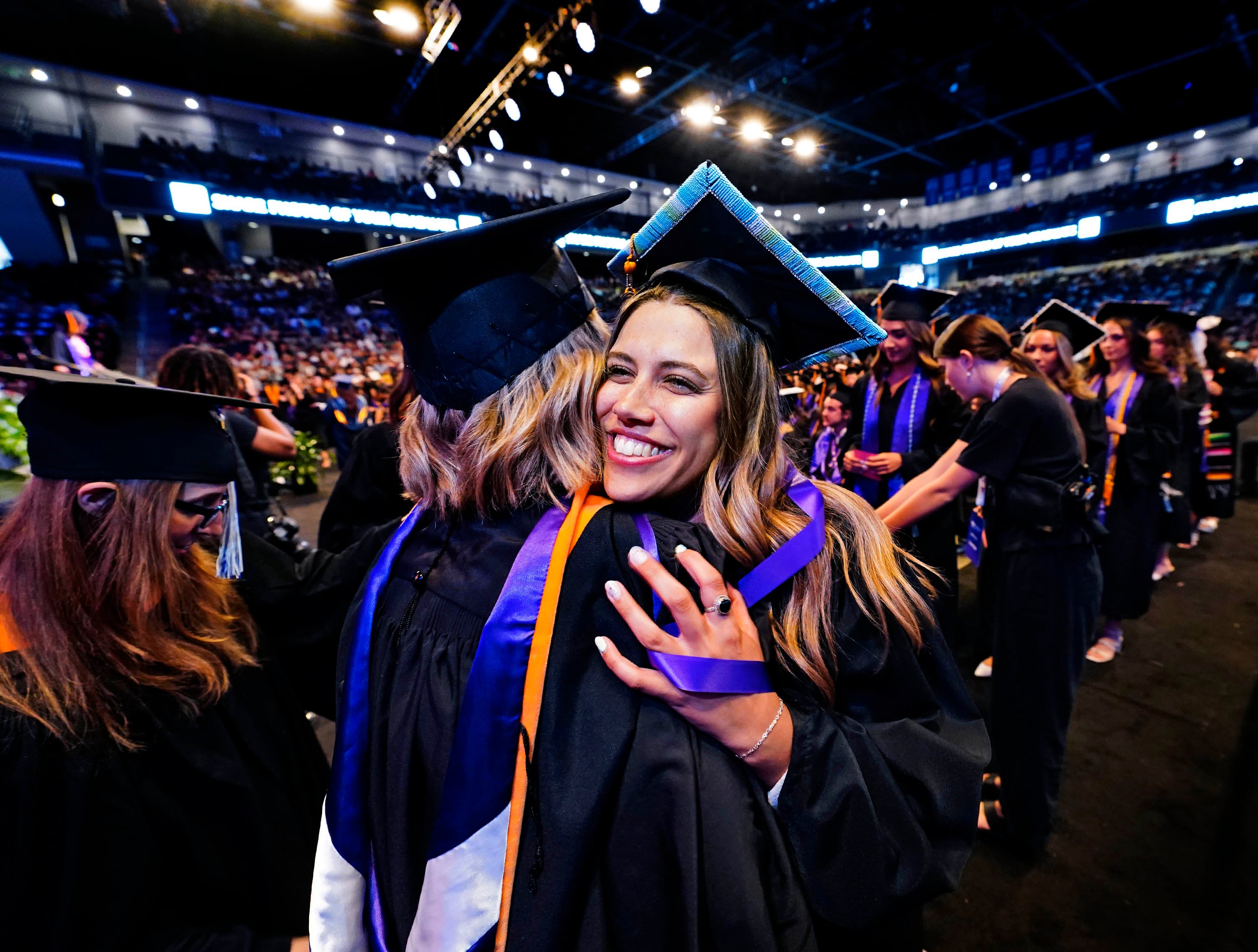 Graduates congratulate each other following the Thursday afternoon commencement ceremony at Global Credit Union Arena on April 23, 2026.