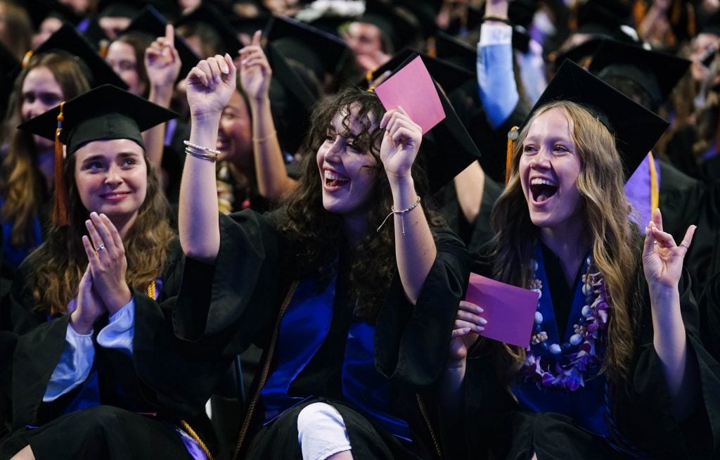Graduates celebrate after receiving their diplomas during the Thursday afternoon commencement ceremony at Global Credit Union Arena on April 23, 2026. -