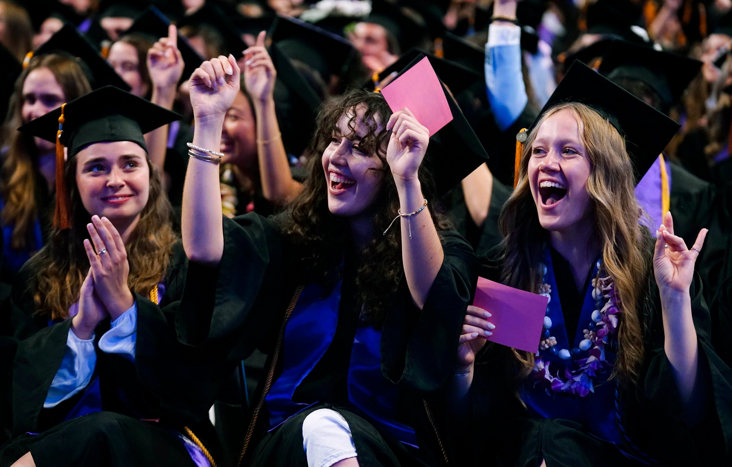 Nursing graduates cheer on their fellow classmates during the Thursday afternoon commencement ceremony at Global Credit Union Arena on April 23, 2026. -