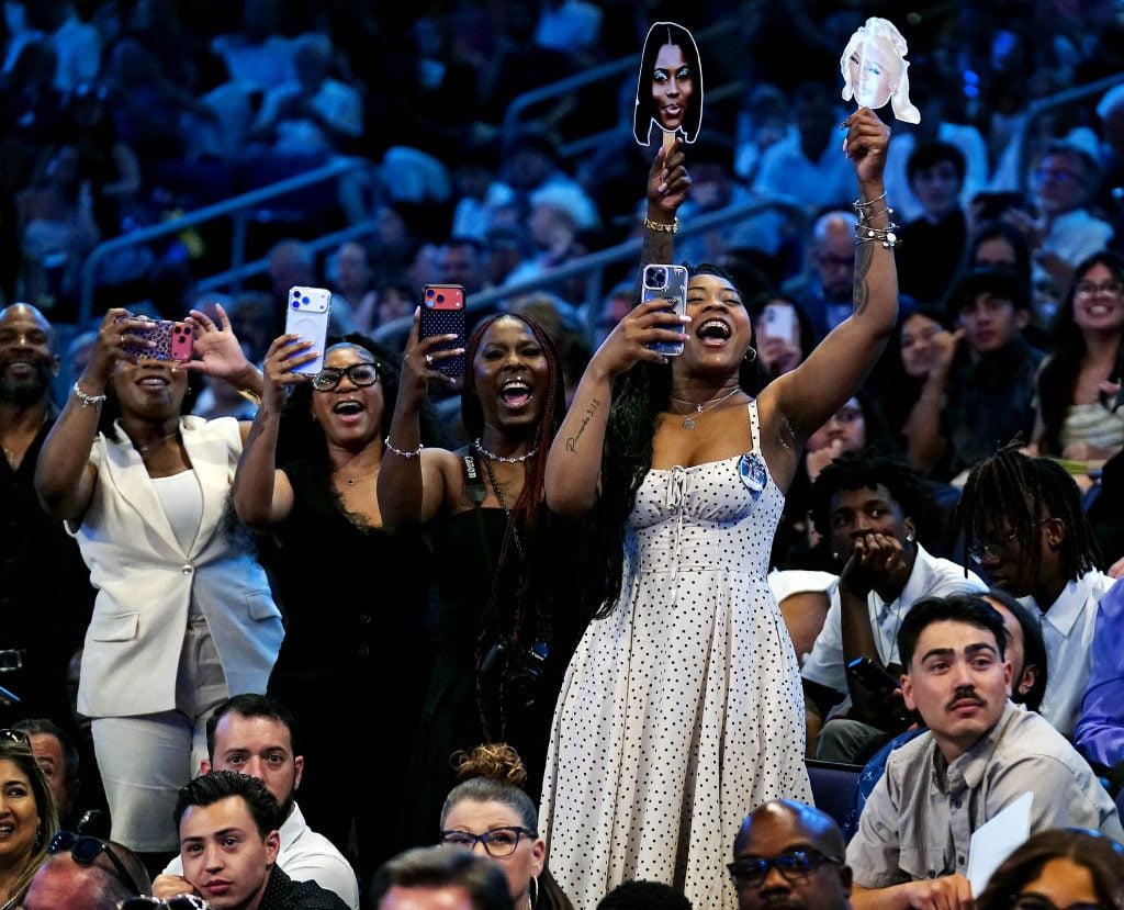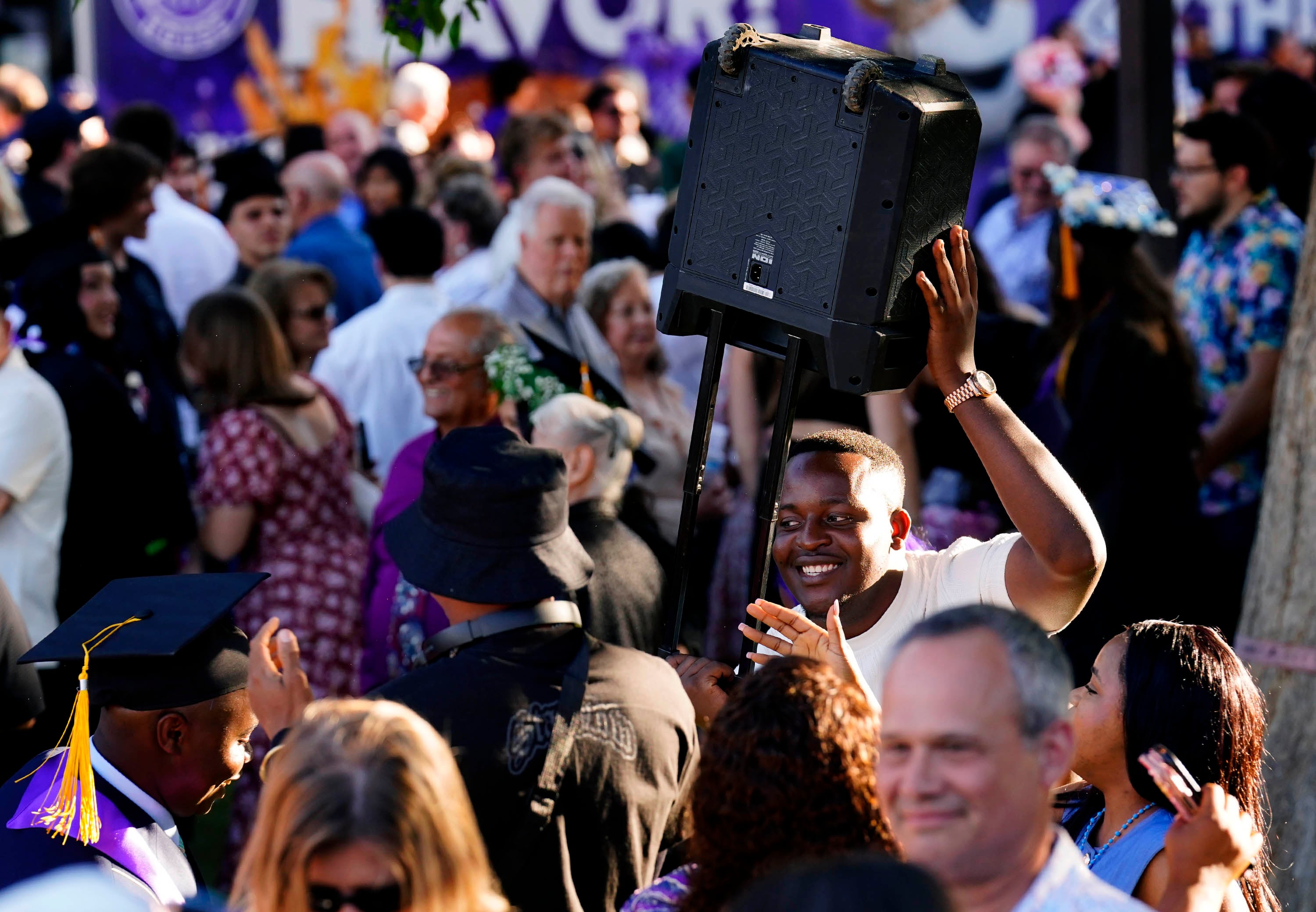 A family member holds up a portable music speaker for his graduate following the Thursday afternoon commencement ceremony at Global Credit Union Arena on April 23, 2026. -