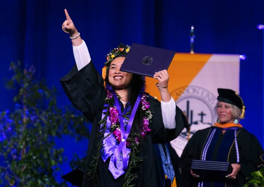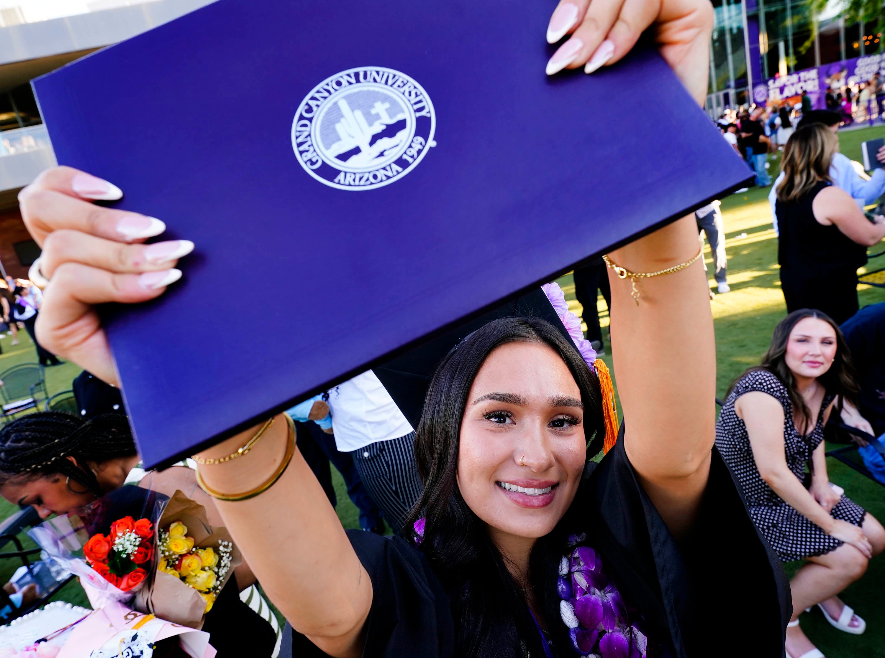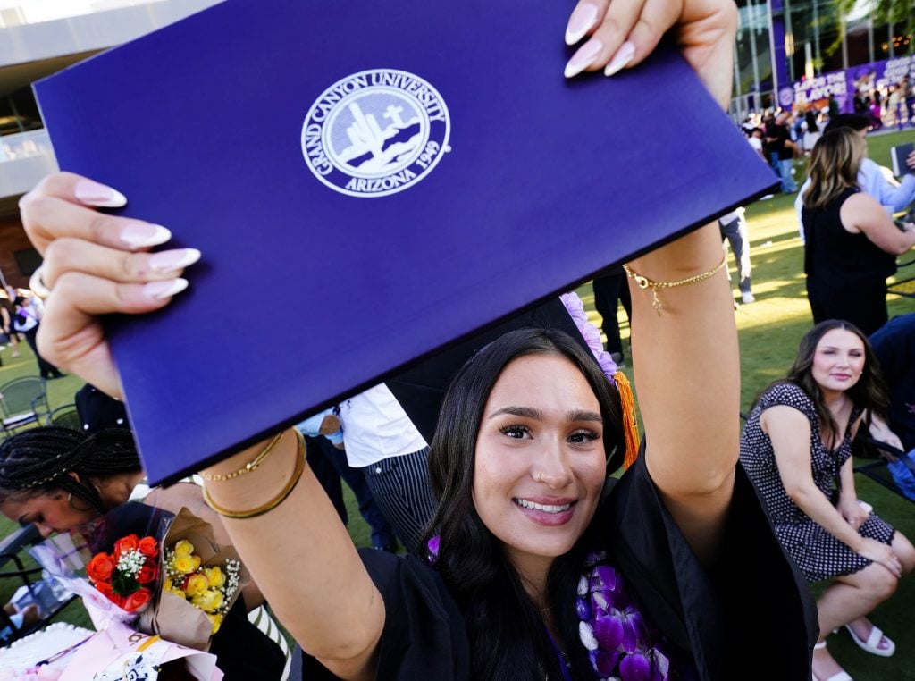A graduate displays her diploma during the Thursday afternoon commencement ceremony at Global Credit Union Arena on April 23, 2026. -