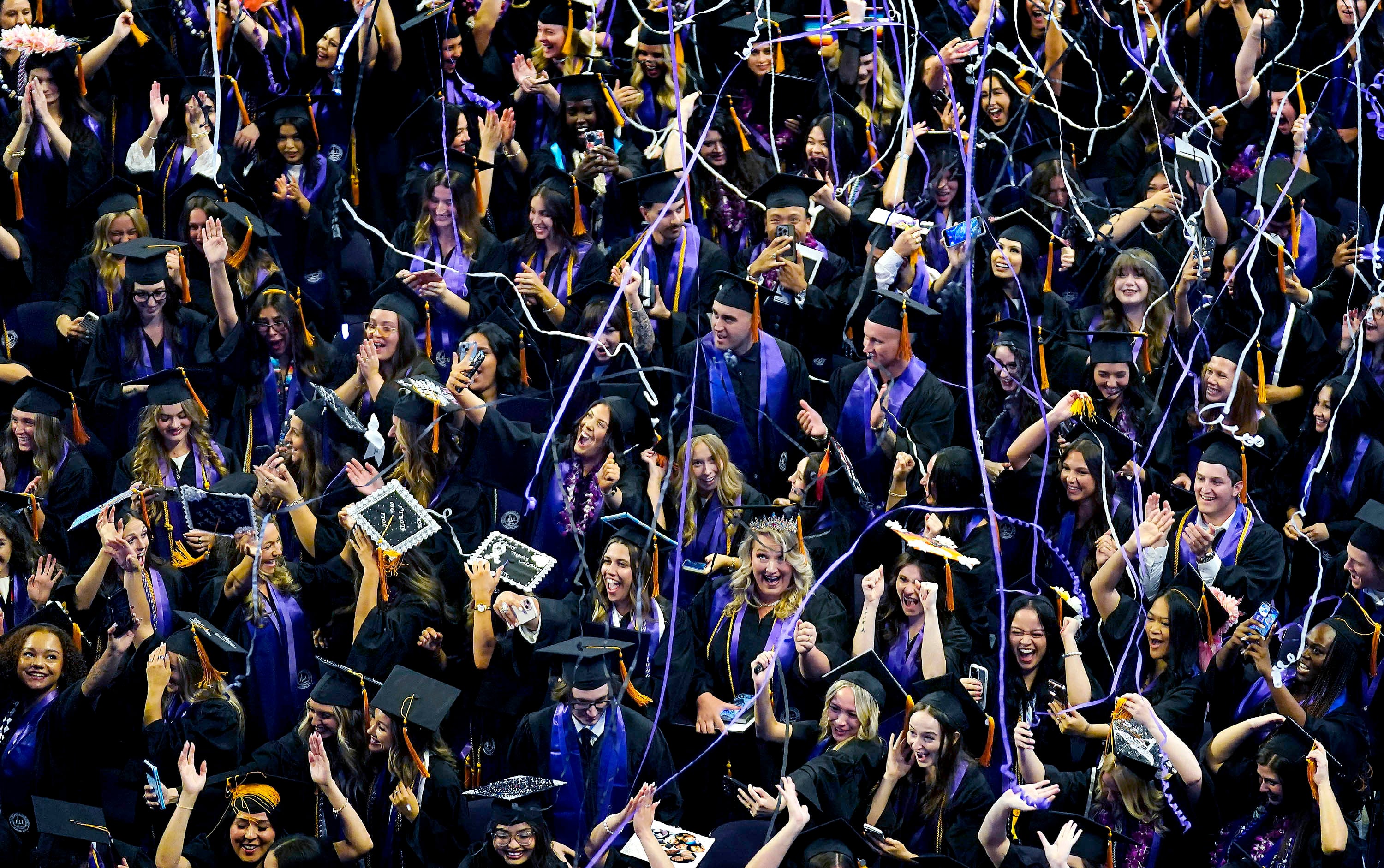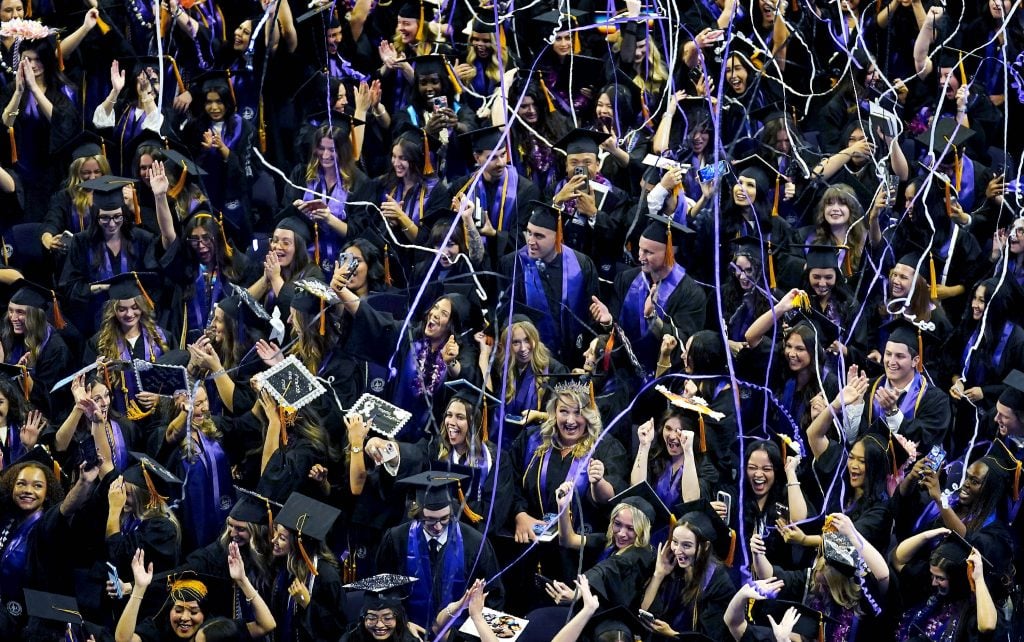Graduates celebrate as confetti streamers rain down during the Thursday afternoon commencement ceremony at Global Credit Union Arena on April 23, 2026. -