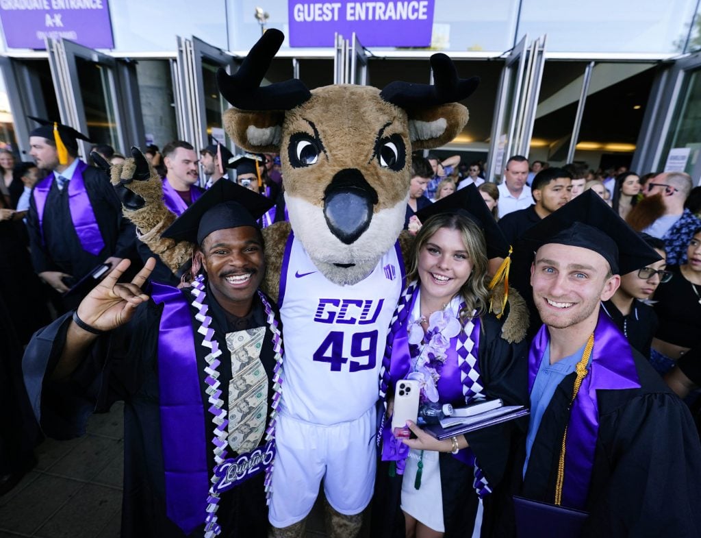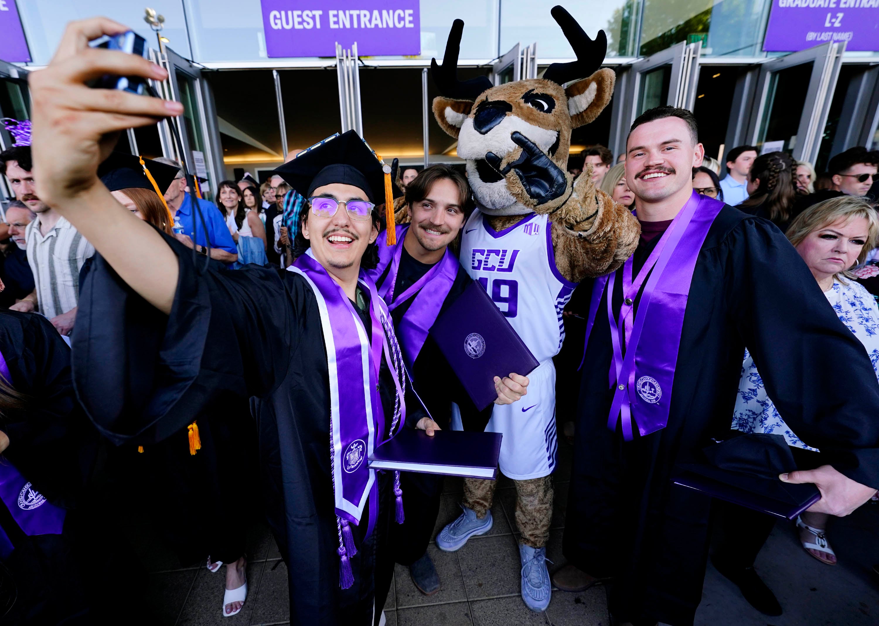 Graduates take selfies with Thunder following the Thursday afternoon commencement ceremony at Global Credit Union Arena on April 23, 2026. -