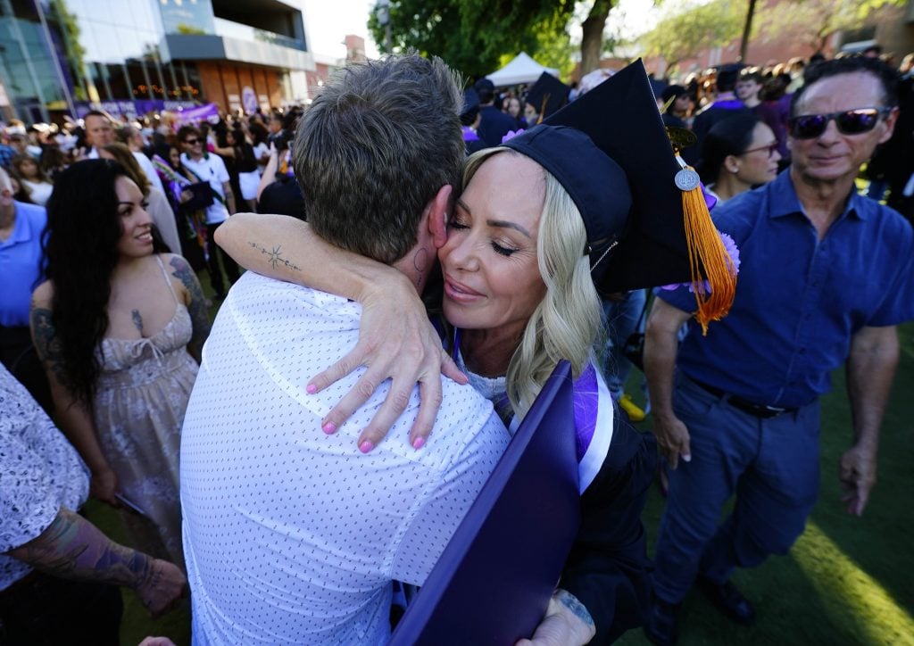 Family and friends congratulate graduates following the Thursday afternoon commencement ceremony at Global Credit Union Arena on April 23, 2026. -
