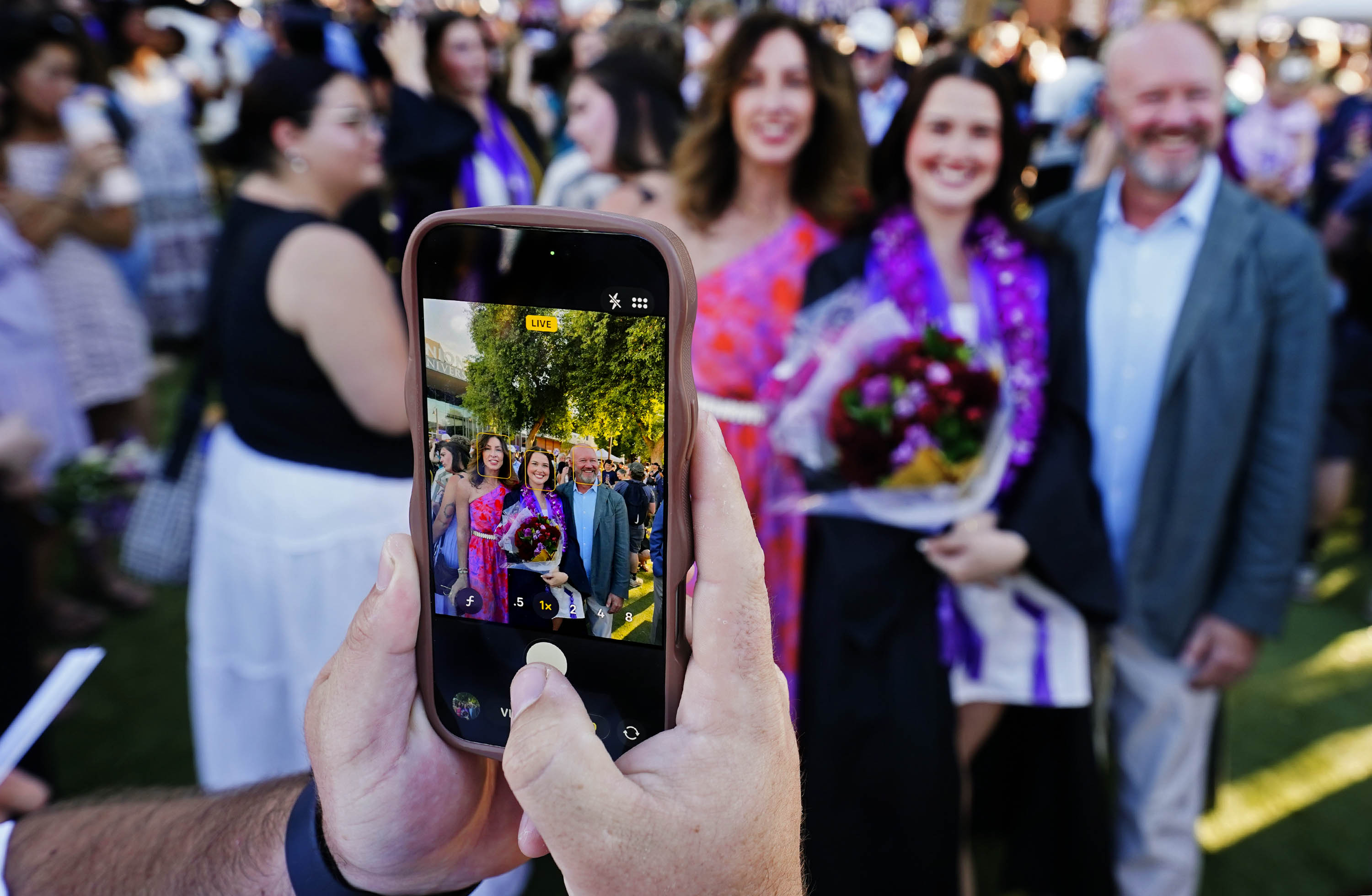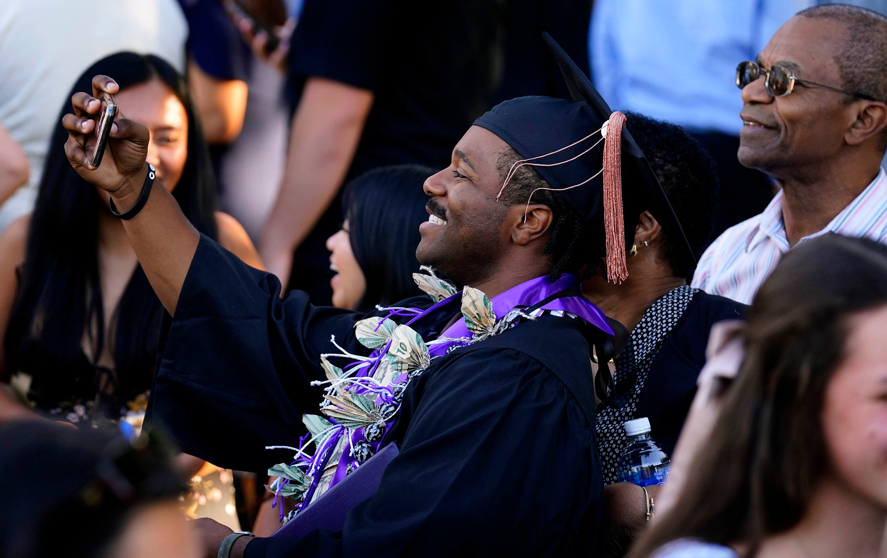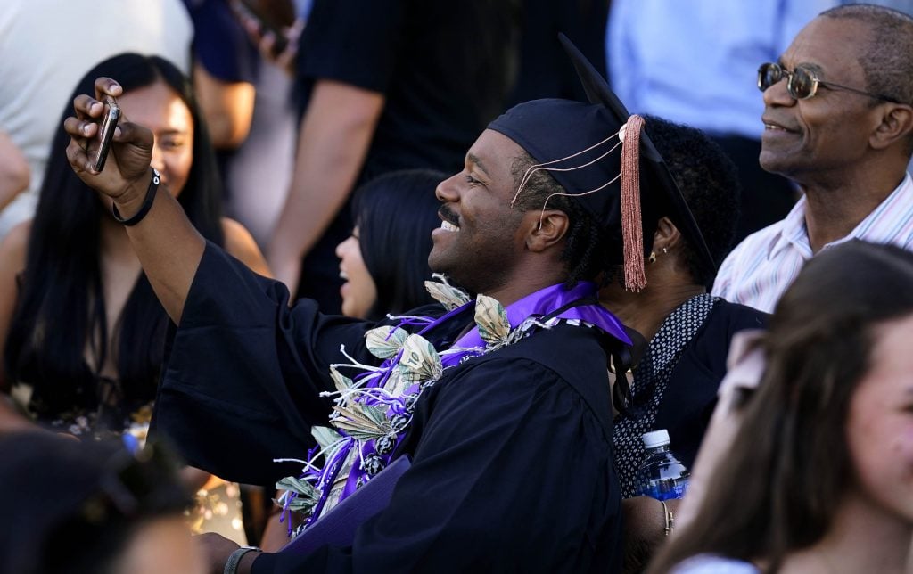 A graduate takes a selfie with family members following the Thursday afternoon commencement ceremony at Global Credit Union Arena on April 23, 2026. -