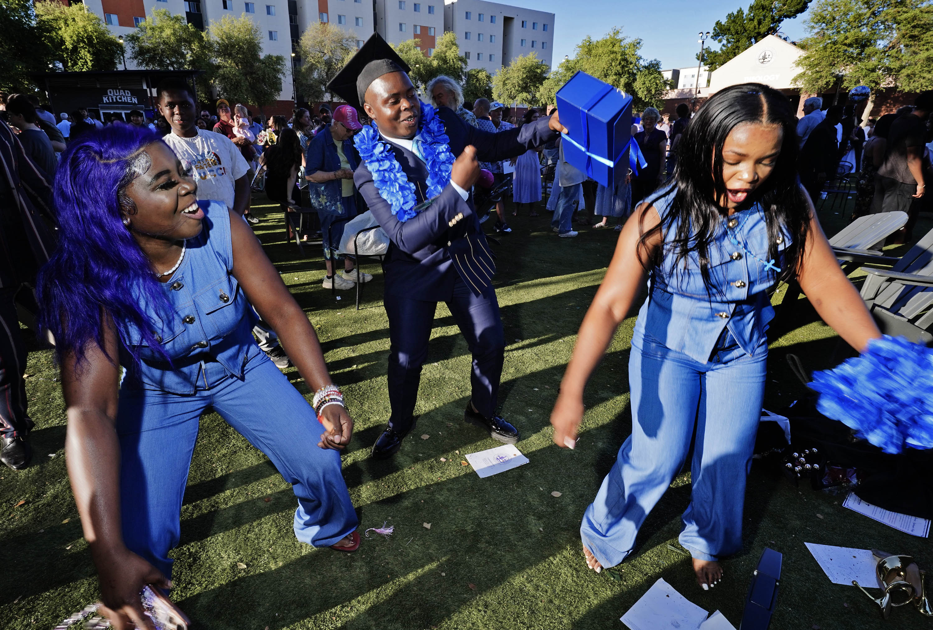 A graduate dances with family members following the Thursday afternoon commencement ceremony at Global Credit Union Arena on April 23, 2026. -