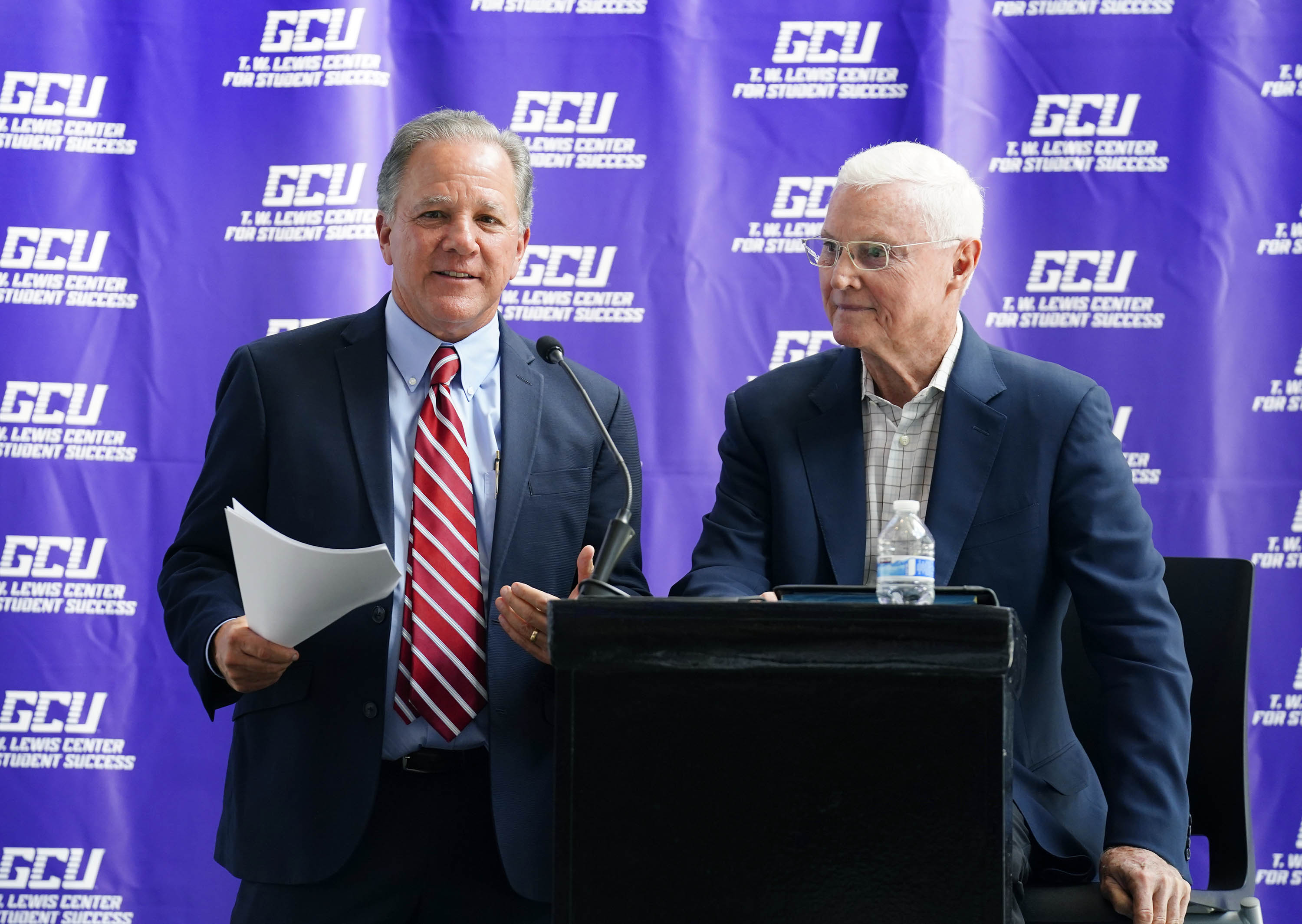 Colangelo College of Business Dean John Kaites (left) and homebuilder and entrepreneur Tom Lewis address the crowd during the official opening of the T.W. Lewis Center for Student Success. Oct. 22, 2025. -