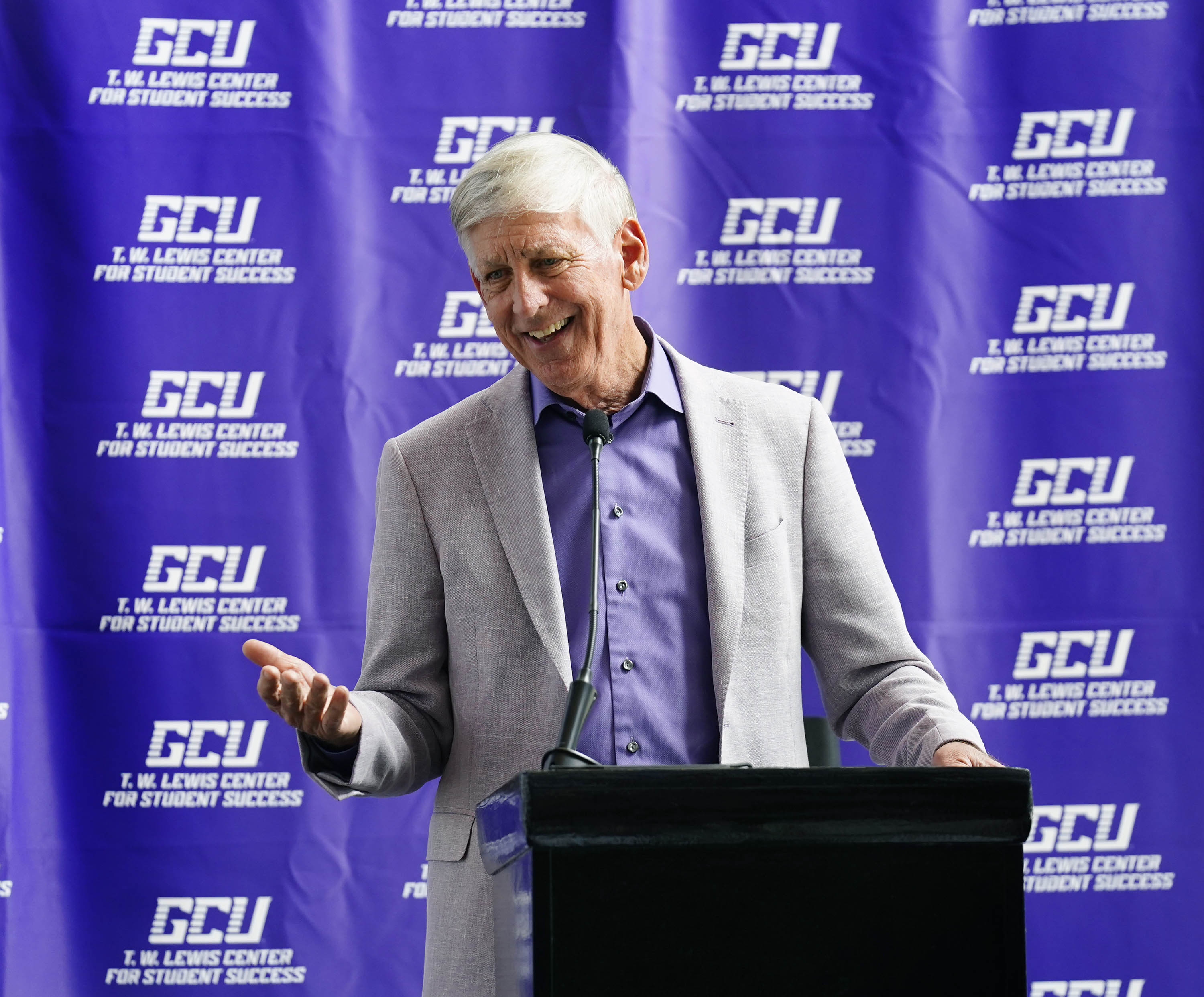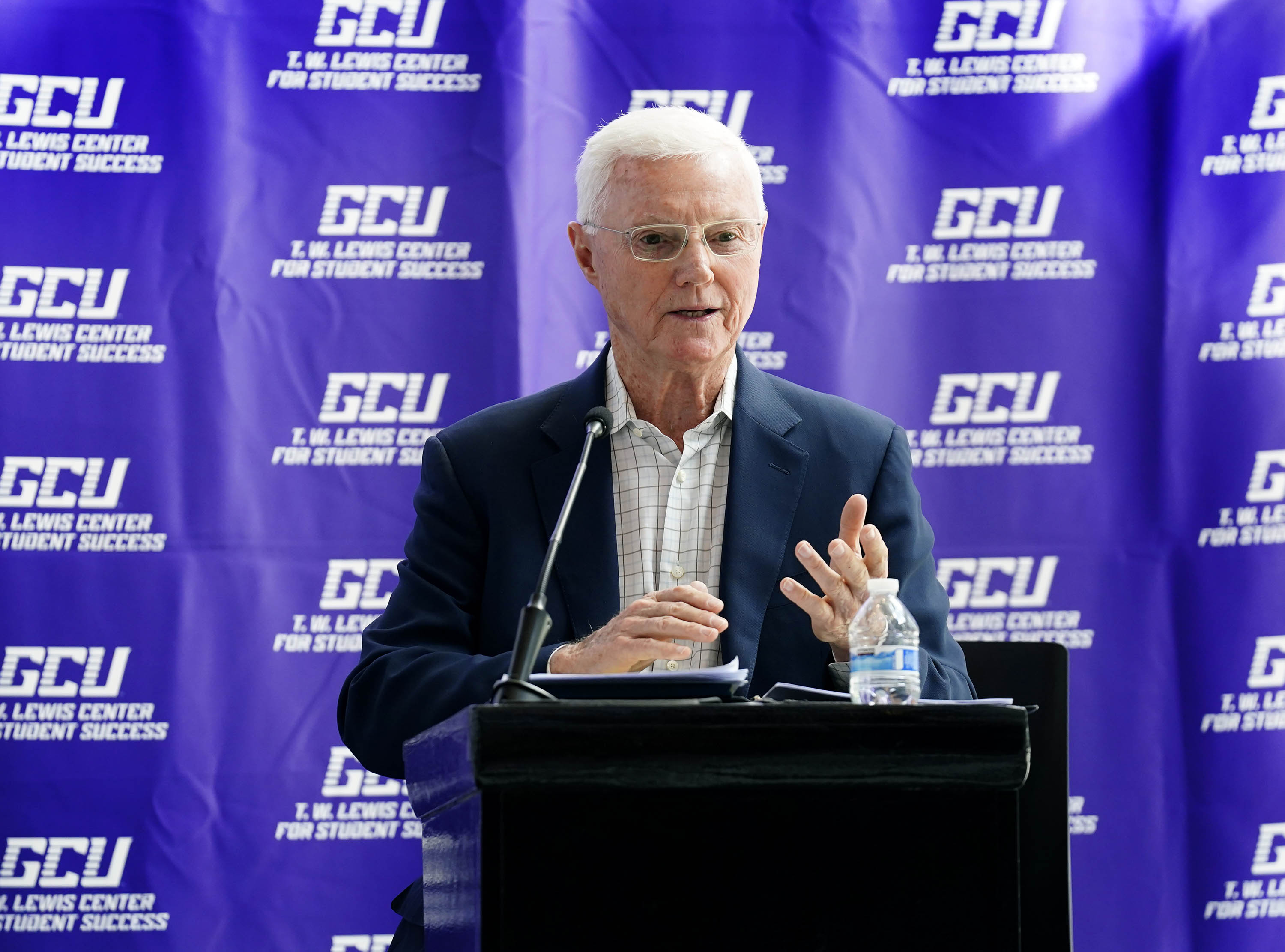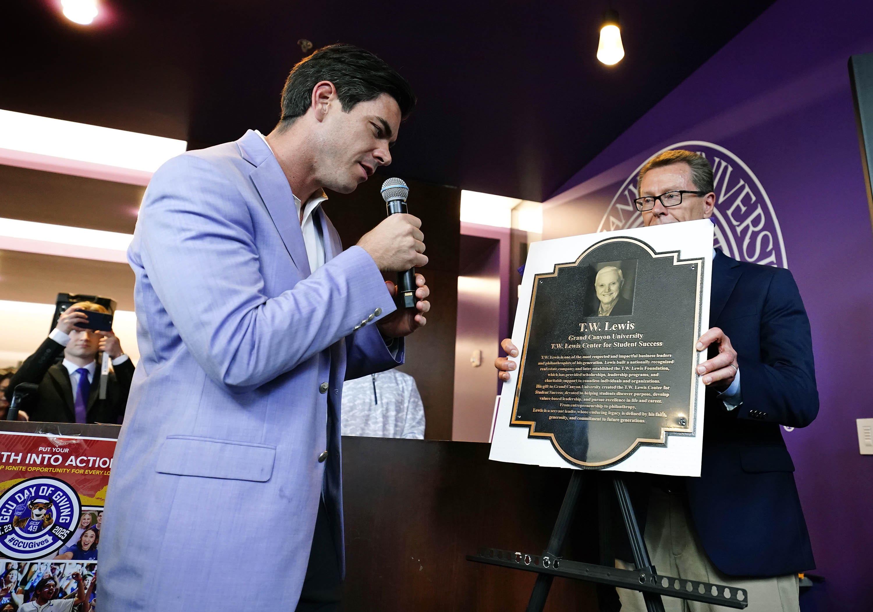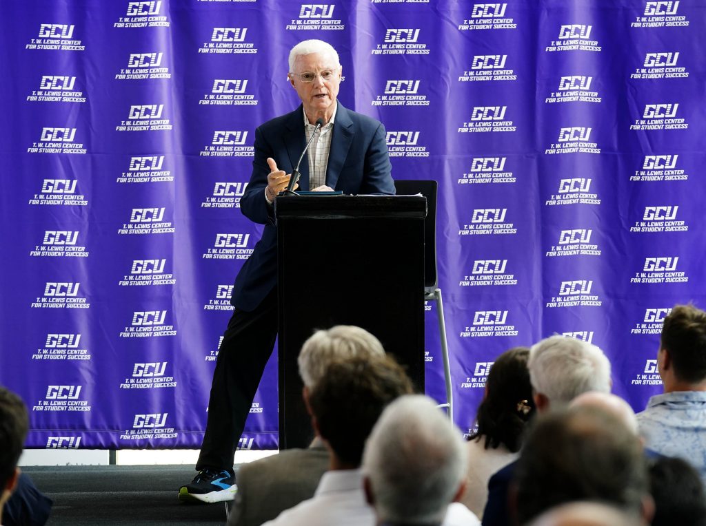 University President Brian Mueller talks about the contributions of award-winning Arizona homebuilder Tom Lewis to the campus during the official opening of the T.W. Lewis Center for Student Success. Oct. 22, 2025. -