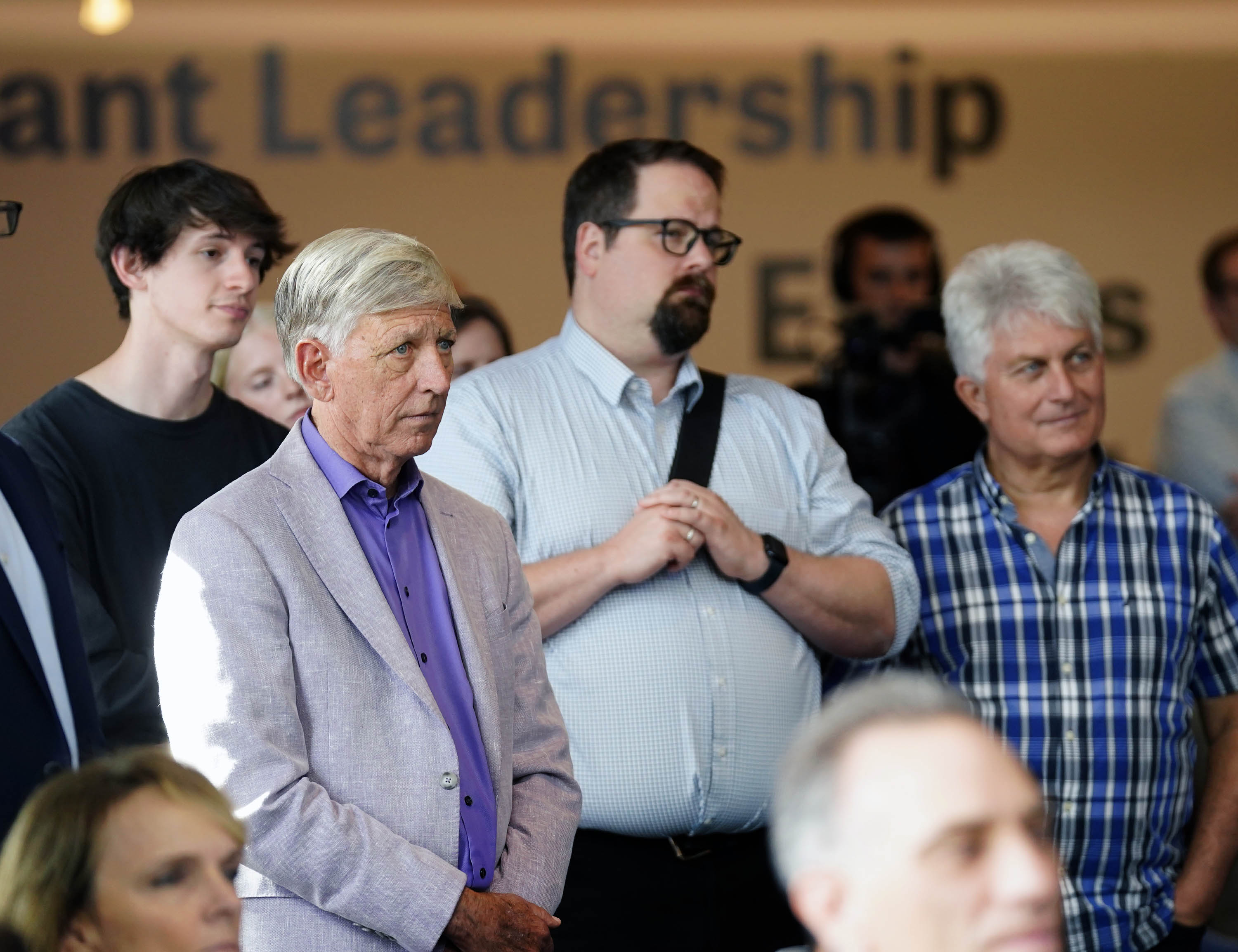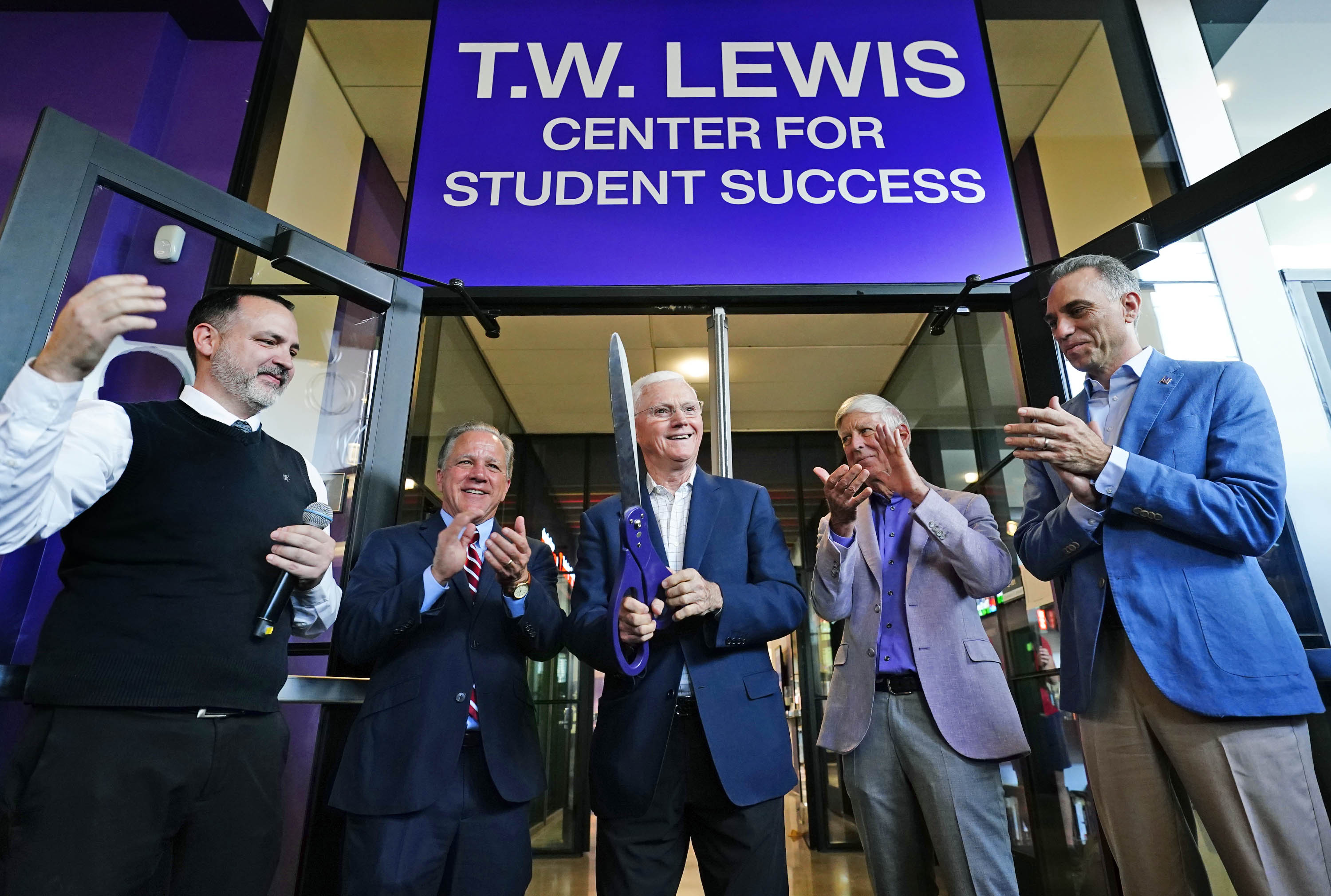 University President Brian Mueller and other faculty listen as Tom Lewis speaks during the official opening of the T.W. Lewis Center for Student Success. Oct. 22, 2025. -