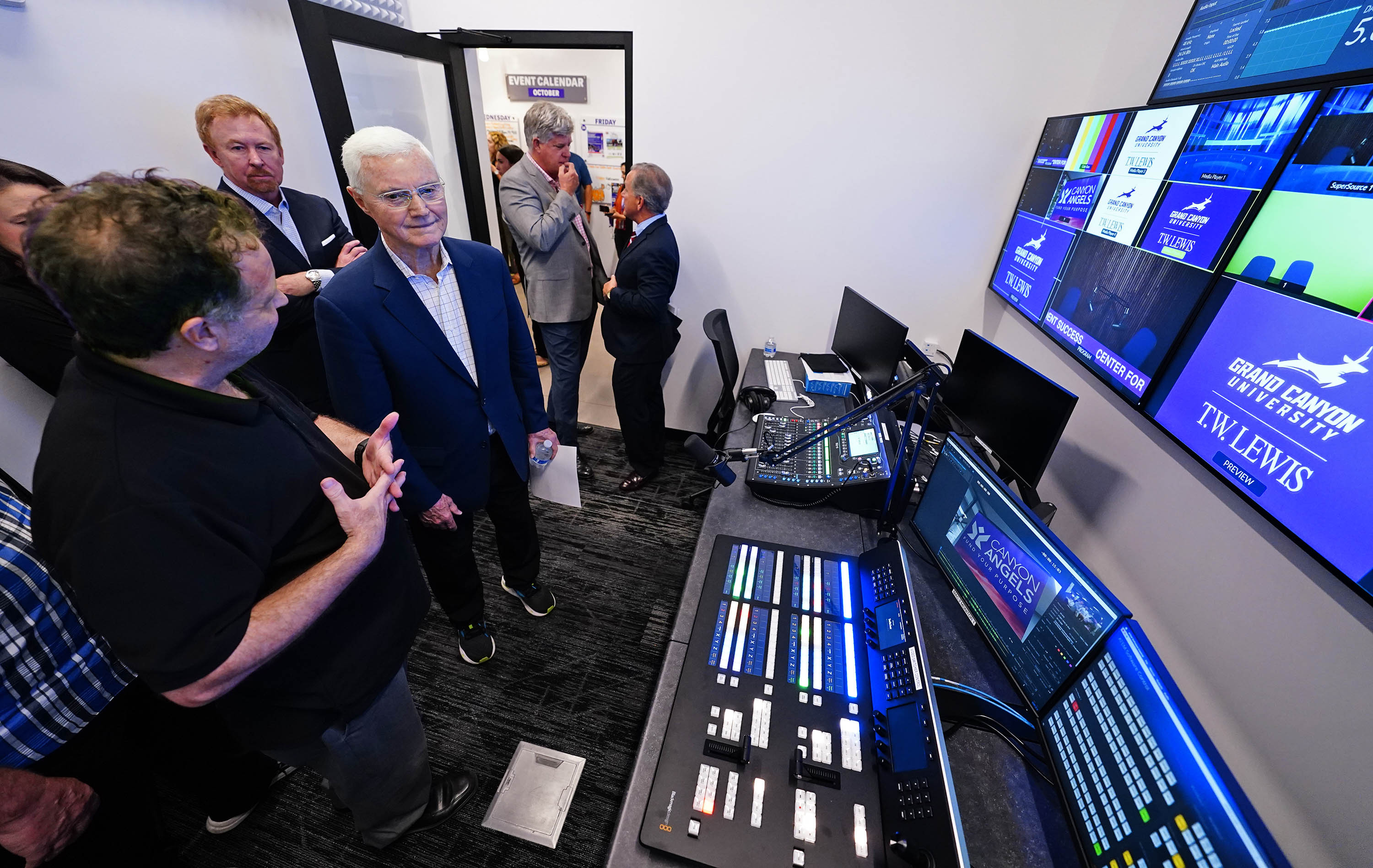 Tom Lewis (center) tours the new broadcast control room of the T.W. Lewis Center for Student Success during the official opening of the center at the Colangelo College of Business. Oct. 22, 2025. -