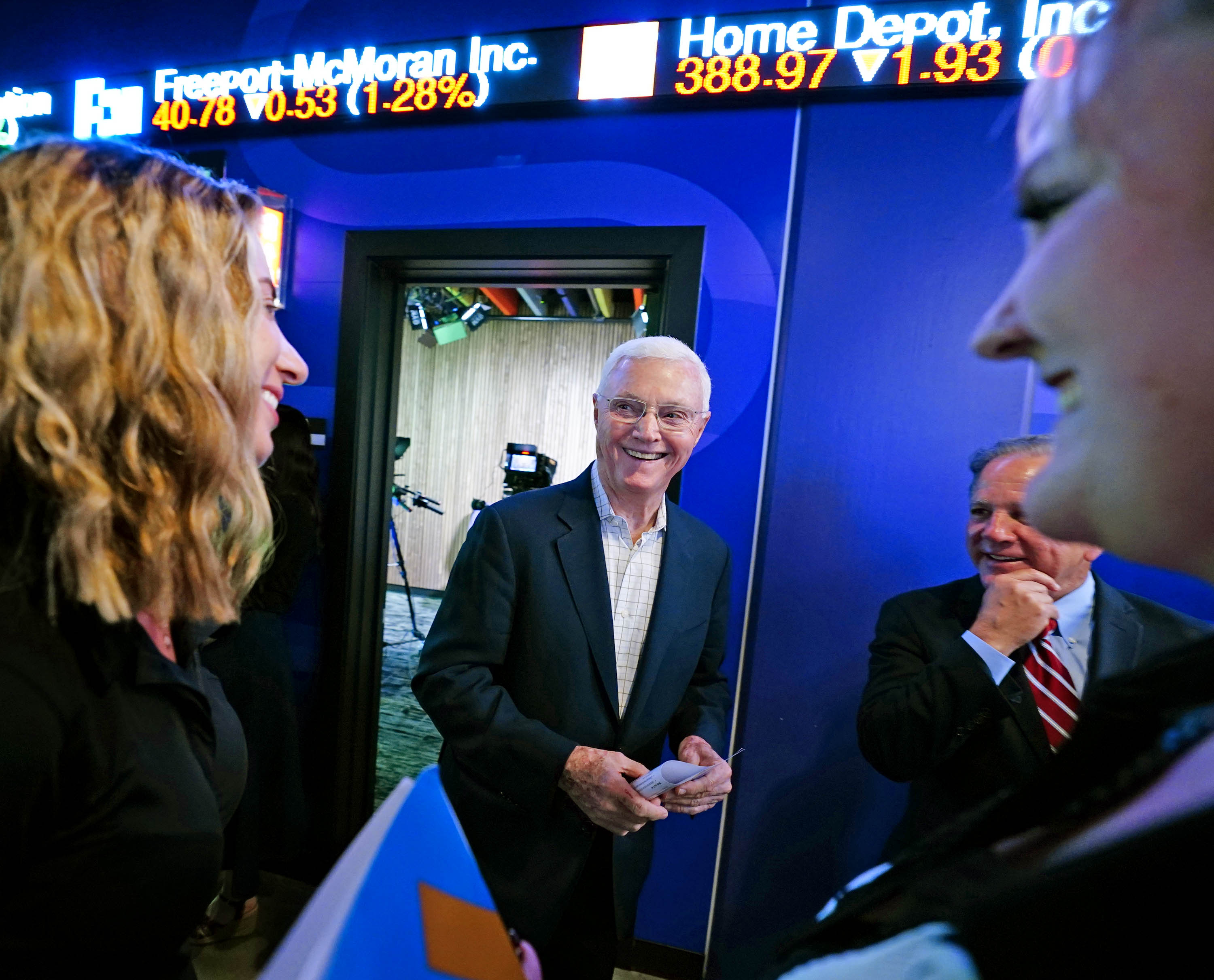 Tom Lewis (center) talks with students as they tour the new T.W. Lewis Center for Student Success during the official opening of the center at the Colangelo College of Business. Oct. 22, 2025. -