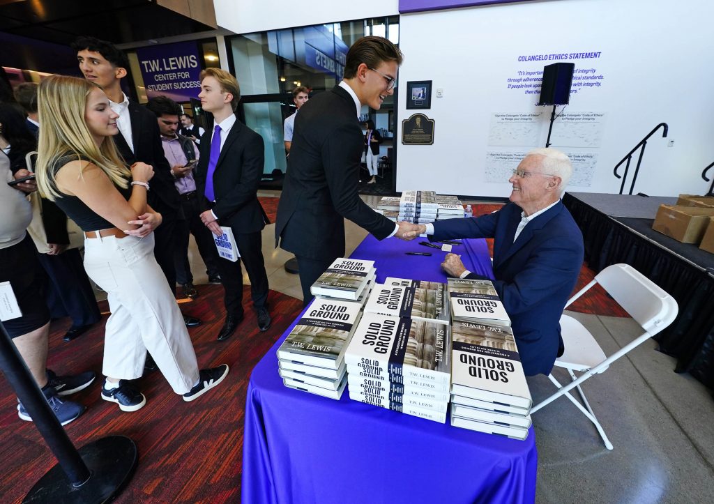 Tom Lewis (right) greets students as he signs his book, “Solid Ground,” during the official opening of the T.W. Lewis Center for Student Success. Oct. 22, 2025.