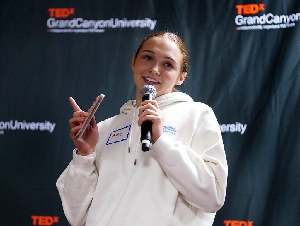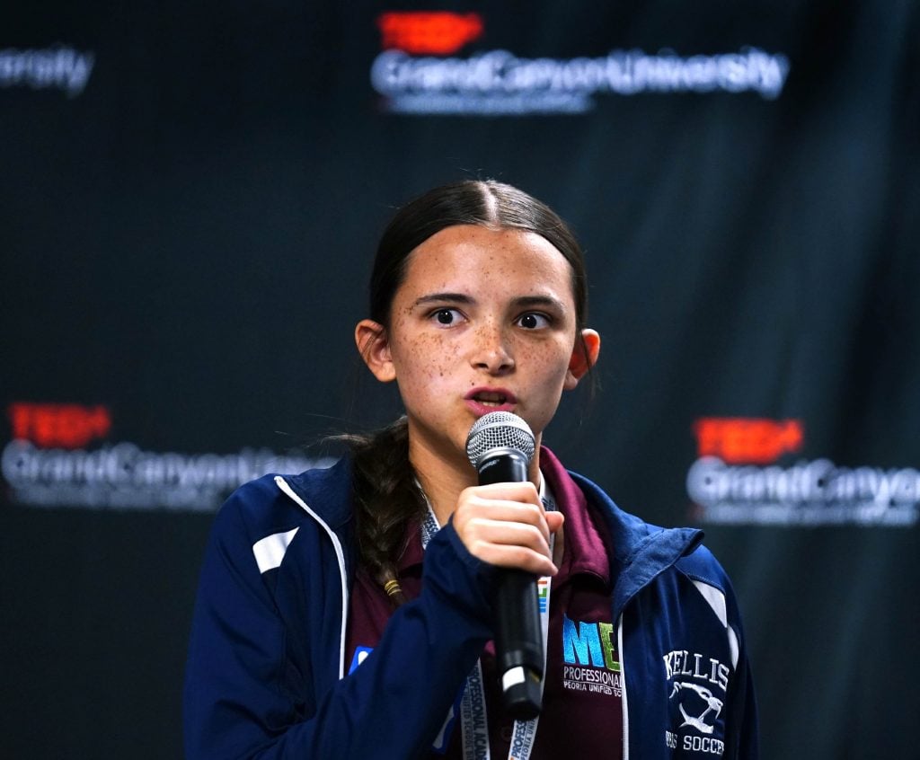 North Valley Christian Academy student Audrey Naranjo gives her team’s TED talk during the TEDx Catalyst event. -