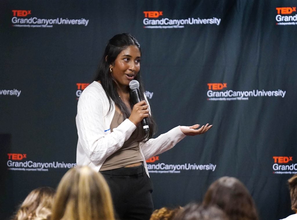 TEDxGCU president Madison Land (left) looks on as students give their TED talks during the TEDx Catalyst event. -