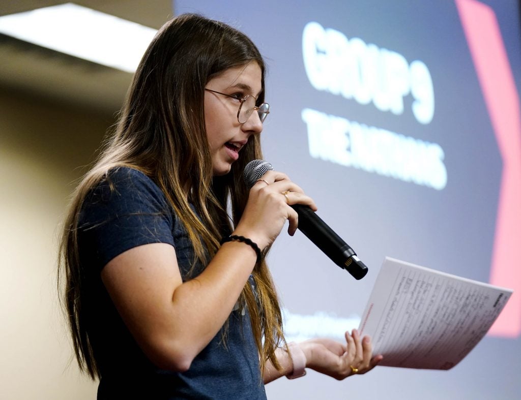 A student delivers her team’s TED talk during the TEDx Catalyst event at Joshua North. -
