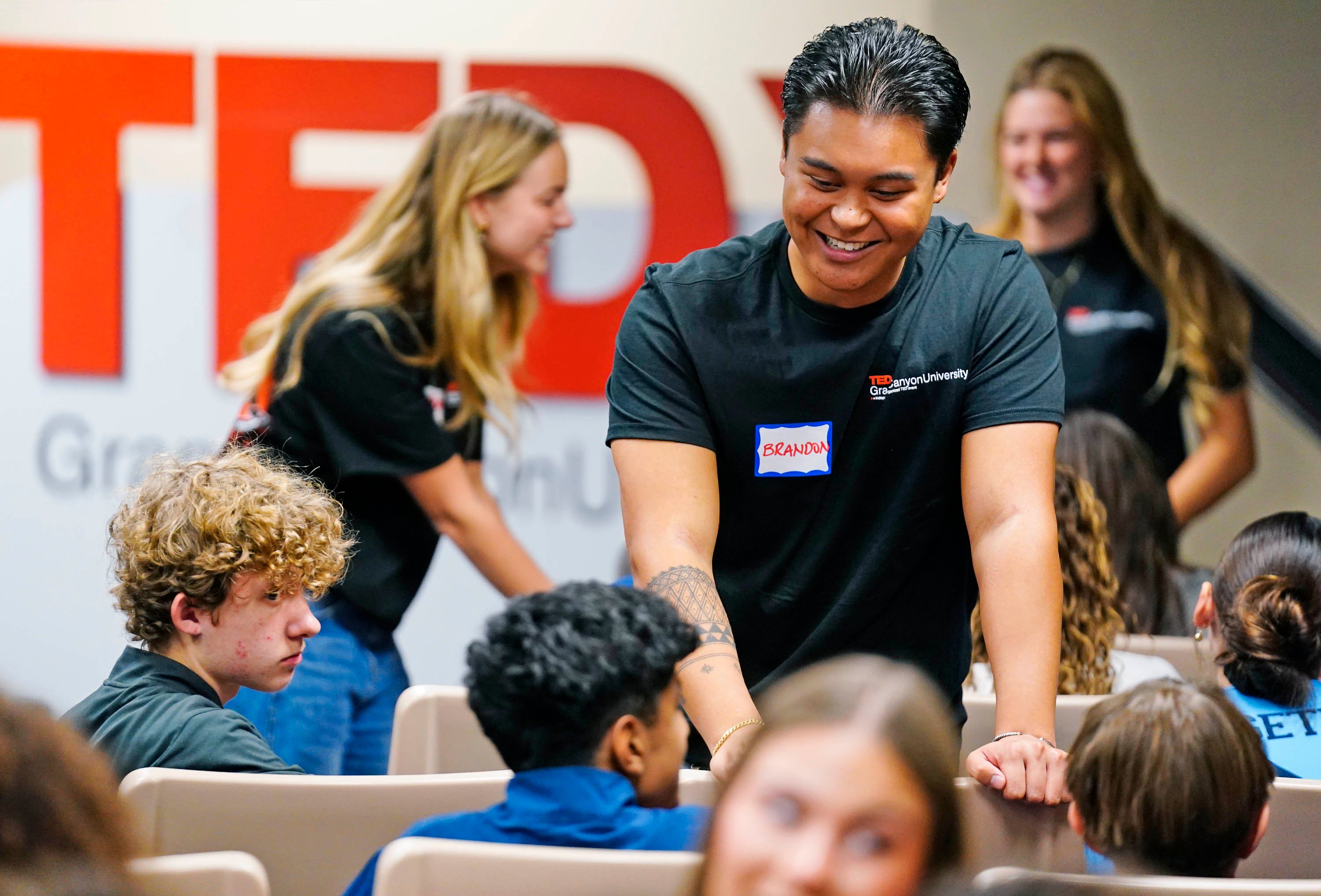 TEDxGCU finance associate Brandon Susi helps students with a topic for their TED talk during the TEDx Catalyst event at Joshua North. -