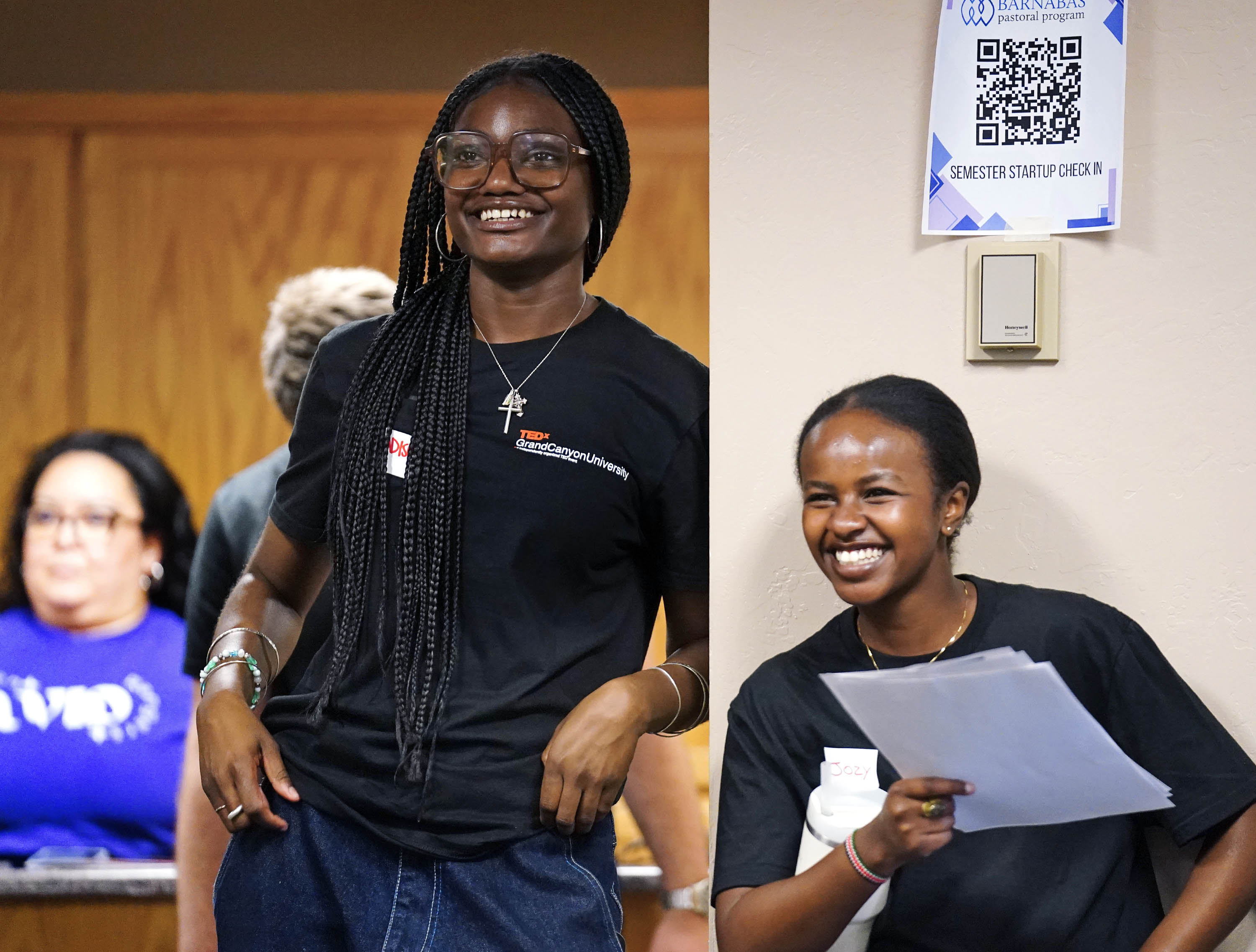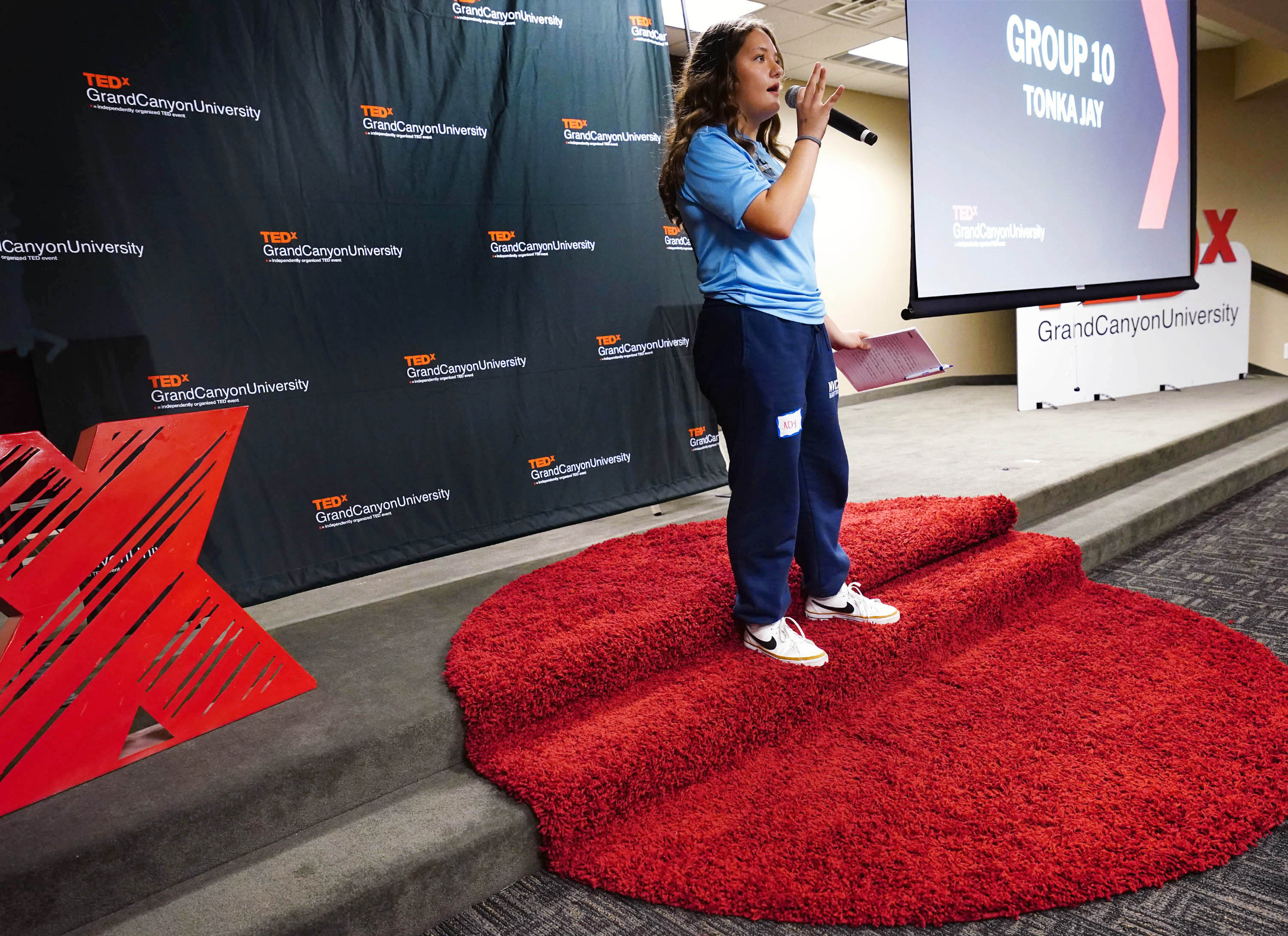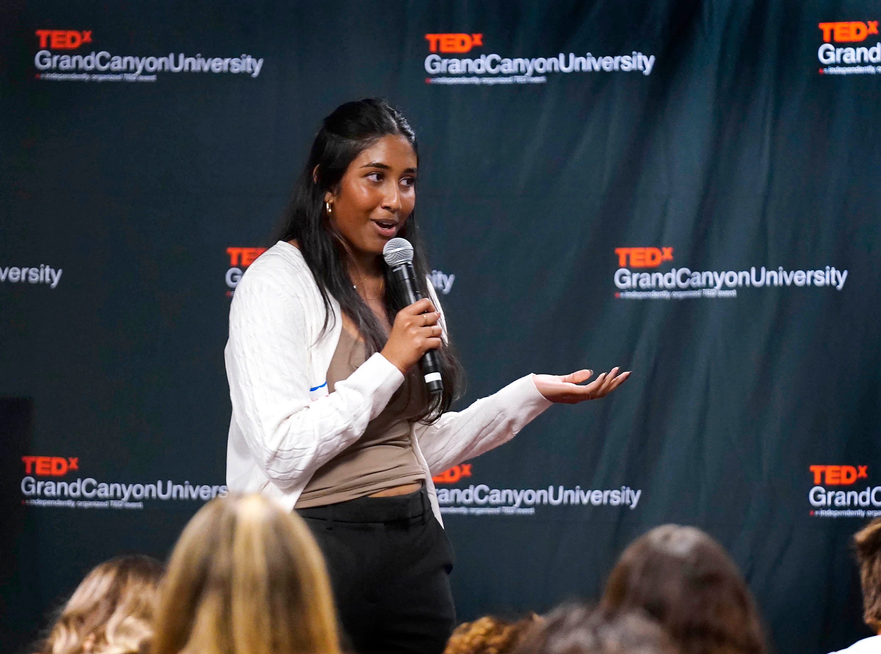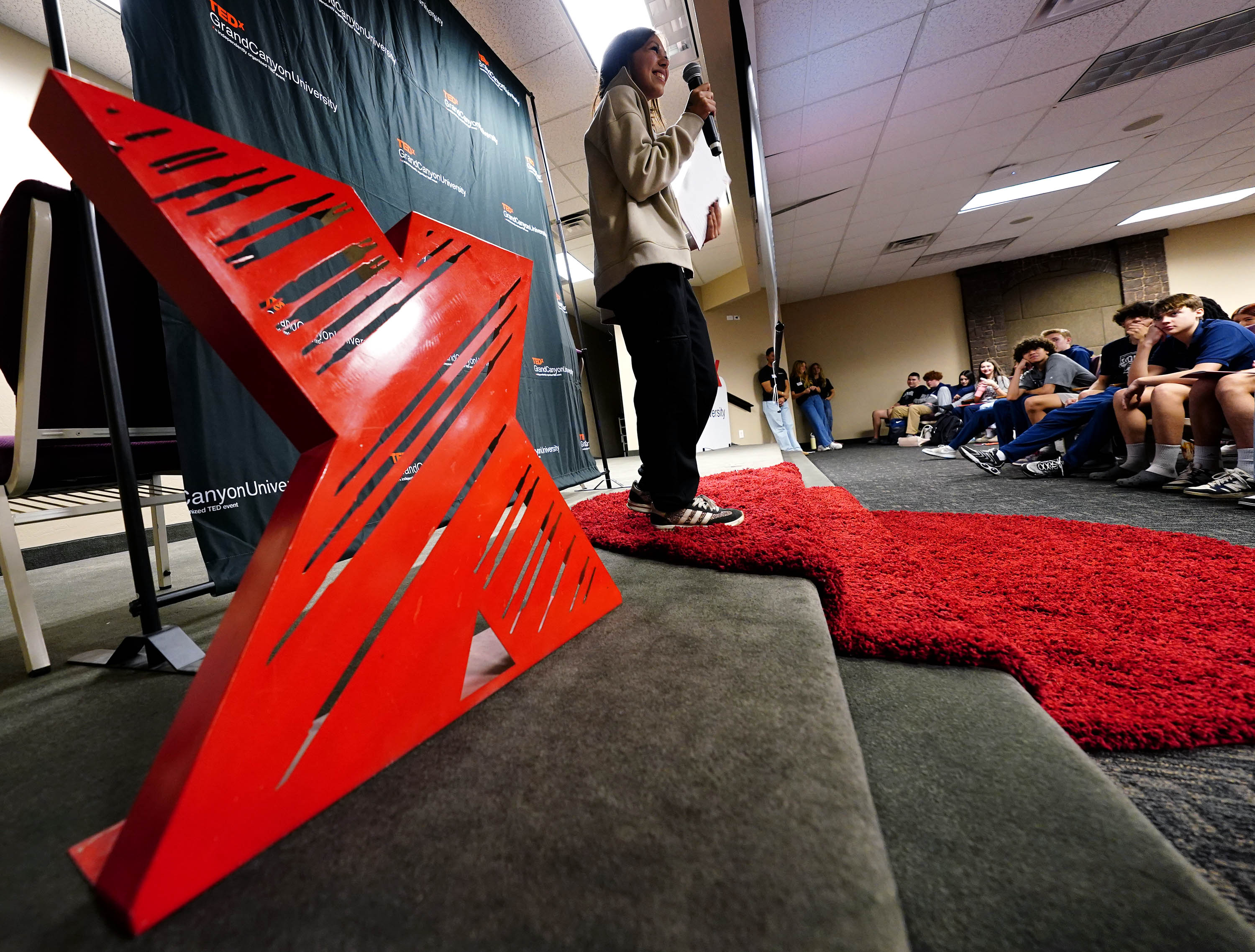 TEDxGCU president Madison Land (left) looks on as students give their TED talks during the TEDx Catalyst event. -