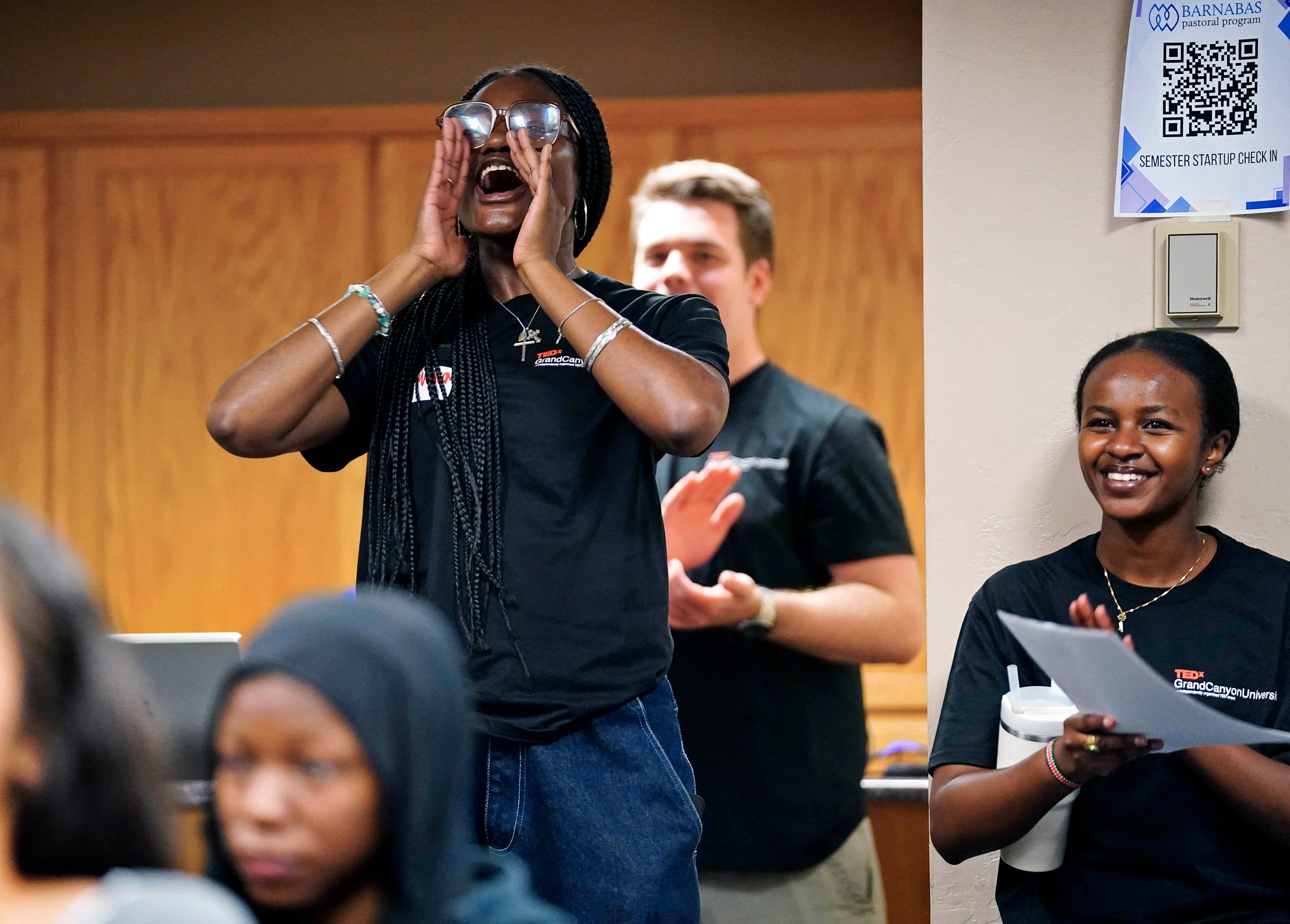 TEDxGCU President Madison Land (left) cheers on the winners of the TEDx Catalyst event at Joshua North.