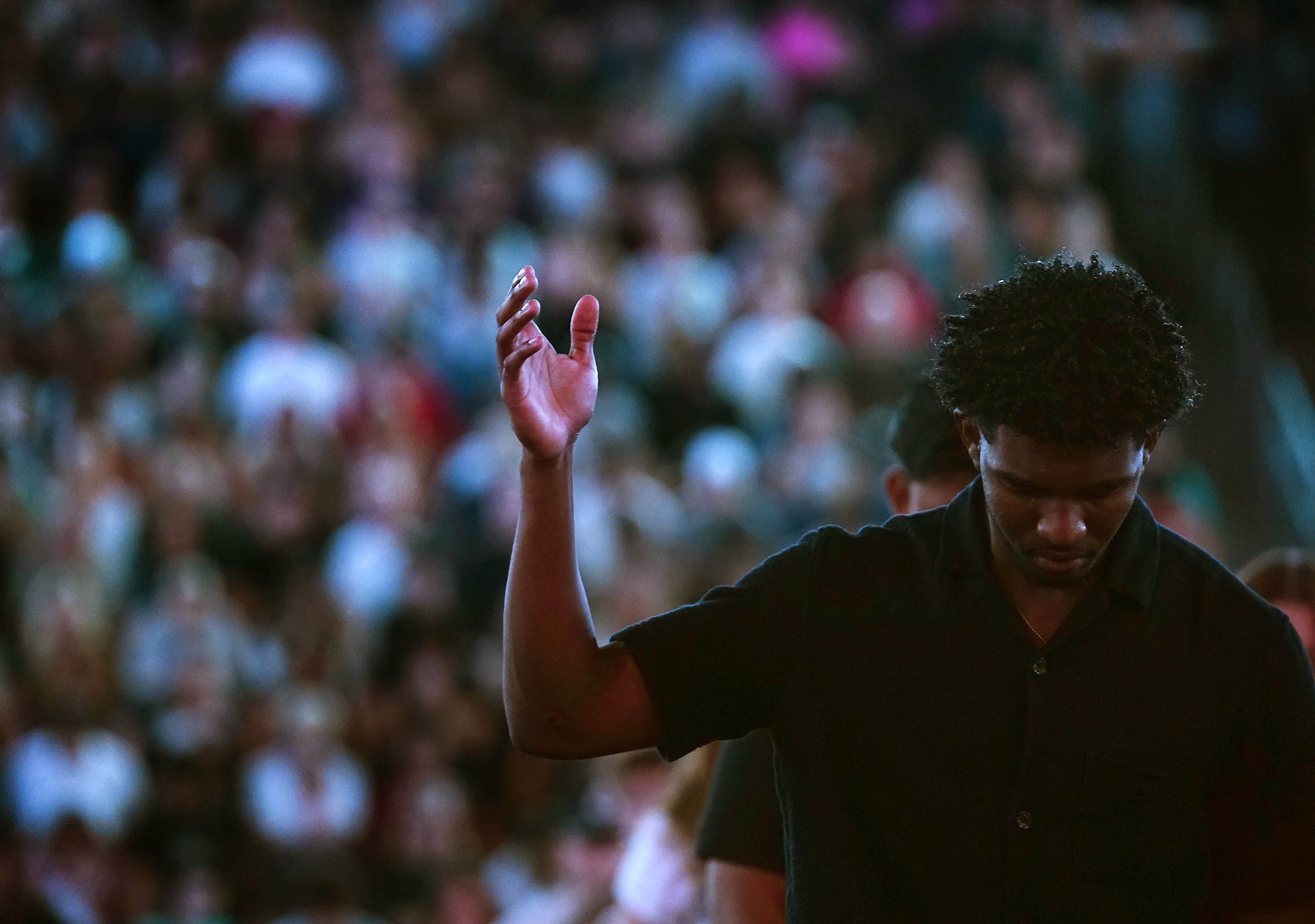 Christian singer/songwriter Forrest Frank gives a thumbs up for the opportunity to speak at GCU during UniteUs GCU at Global Credit Union Arena on Oct. 21, 2025. -
