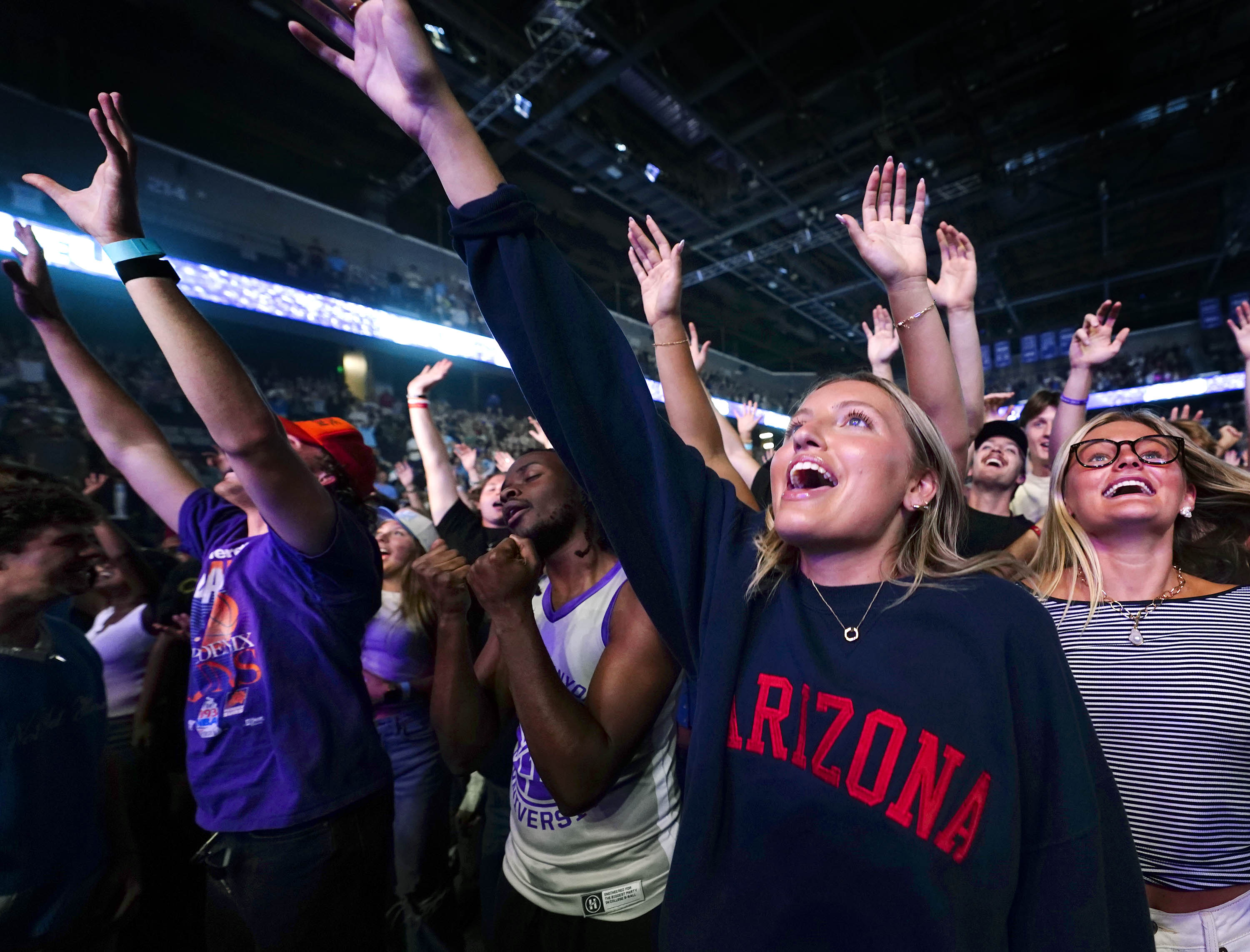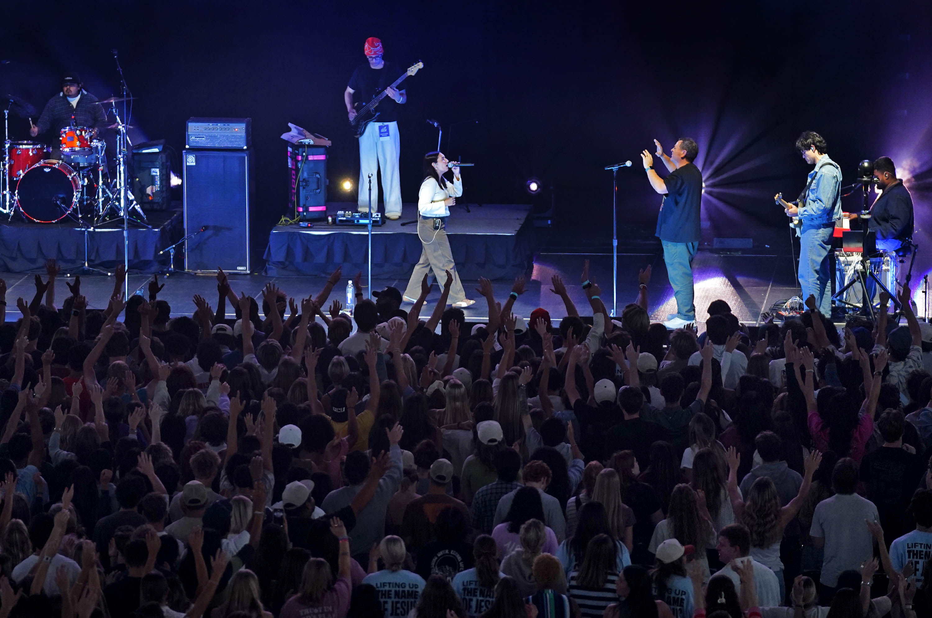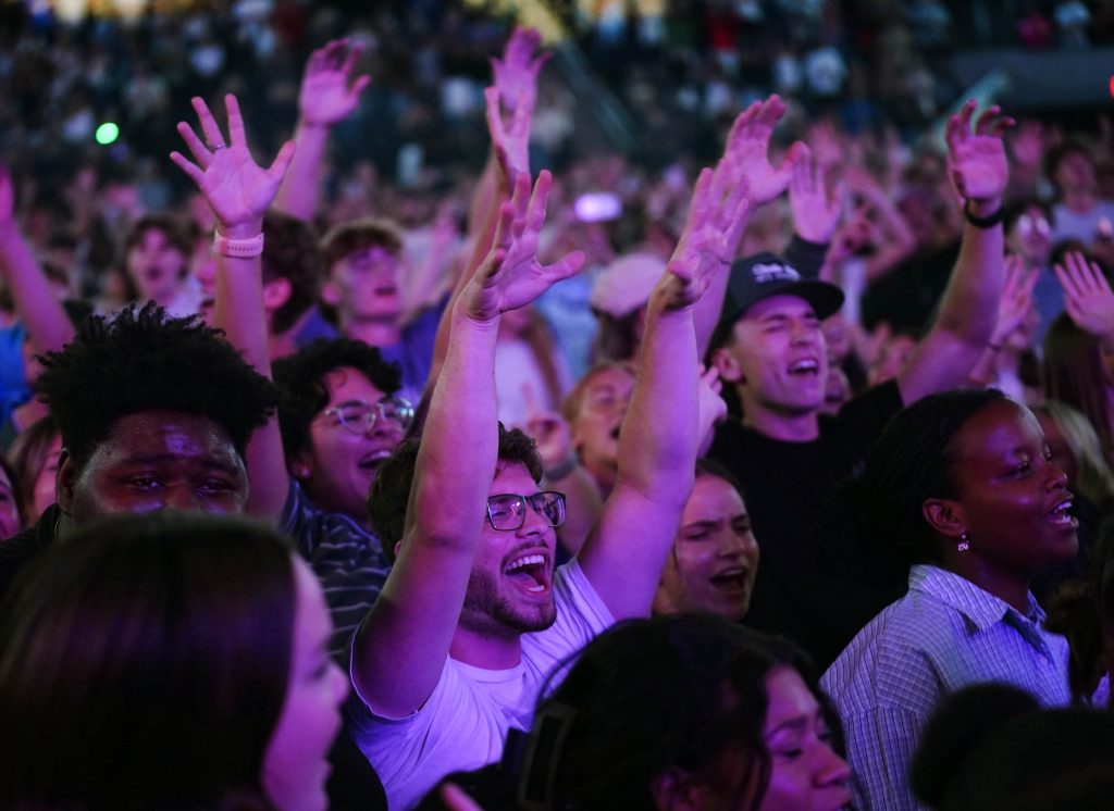 Students give praise as they sing along with worship band UPPERROOM during UniteUs GCU at Global Credit Union Arena on Oct. 21, 2025. -
