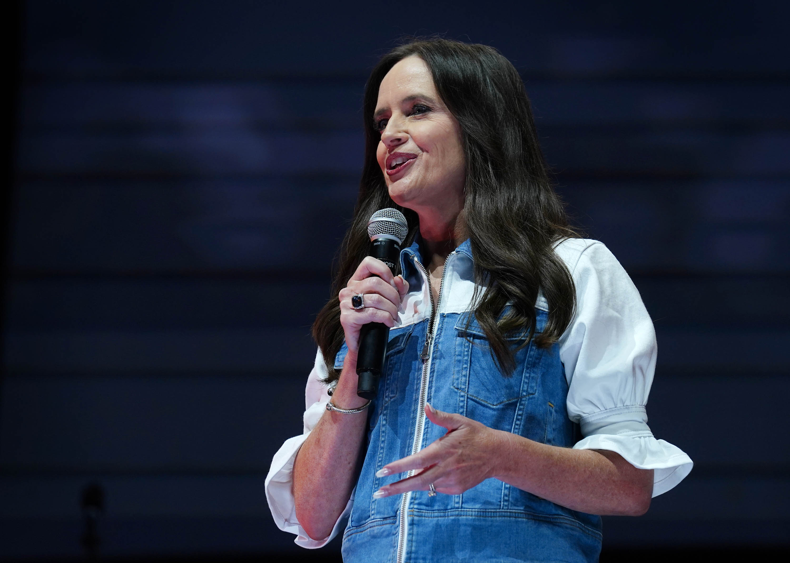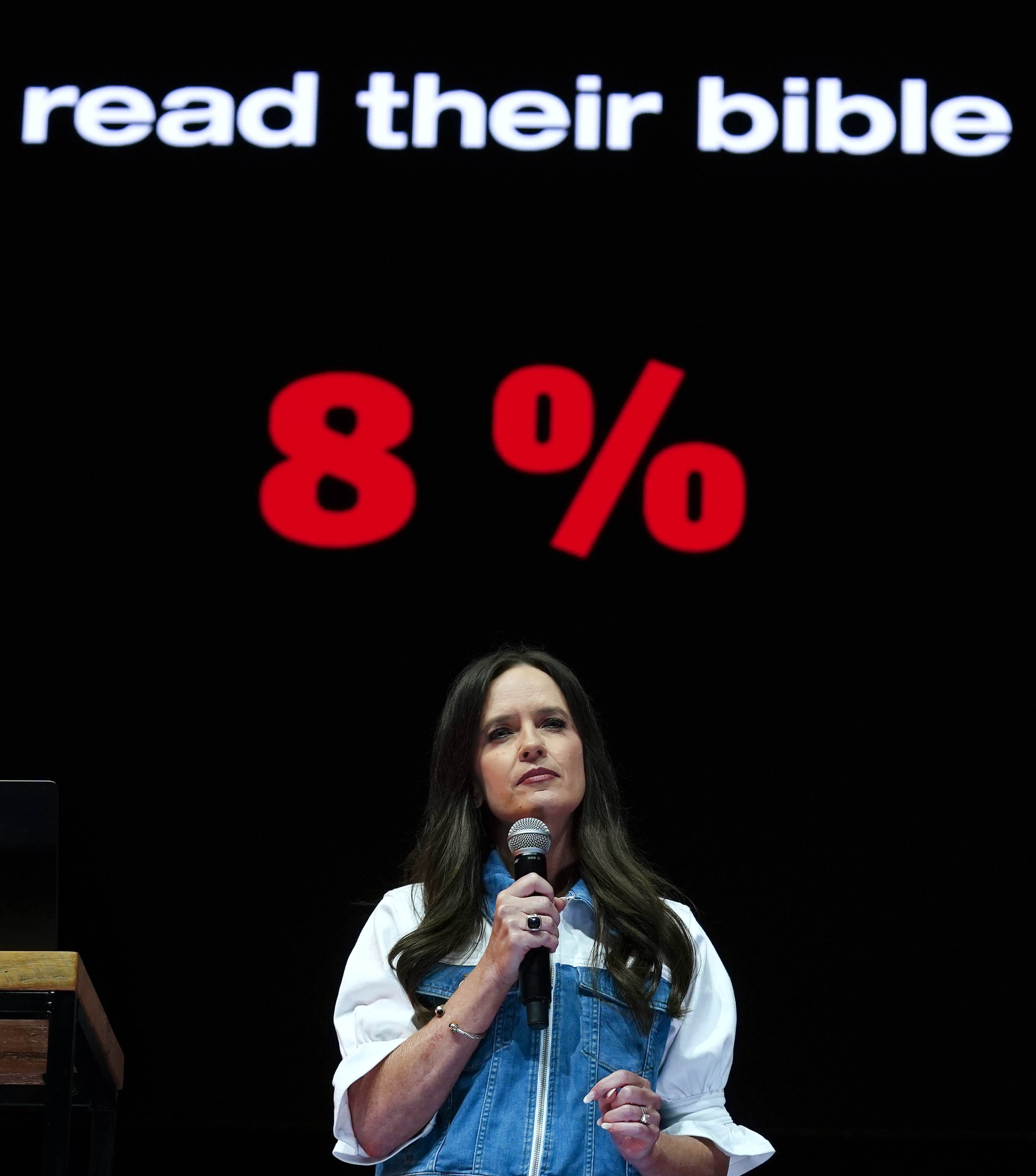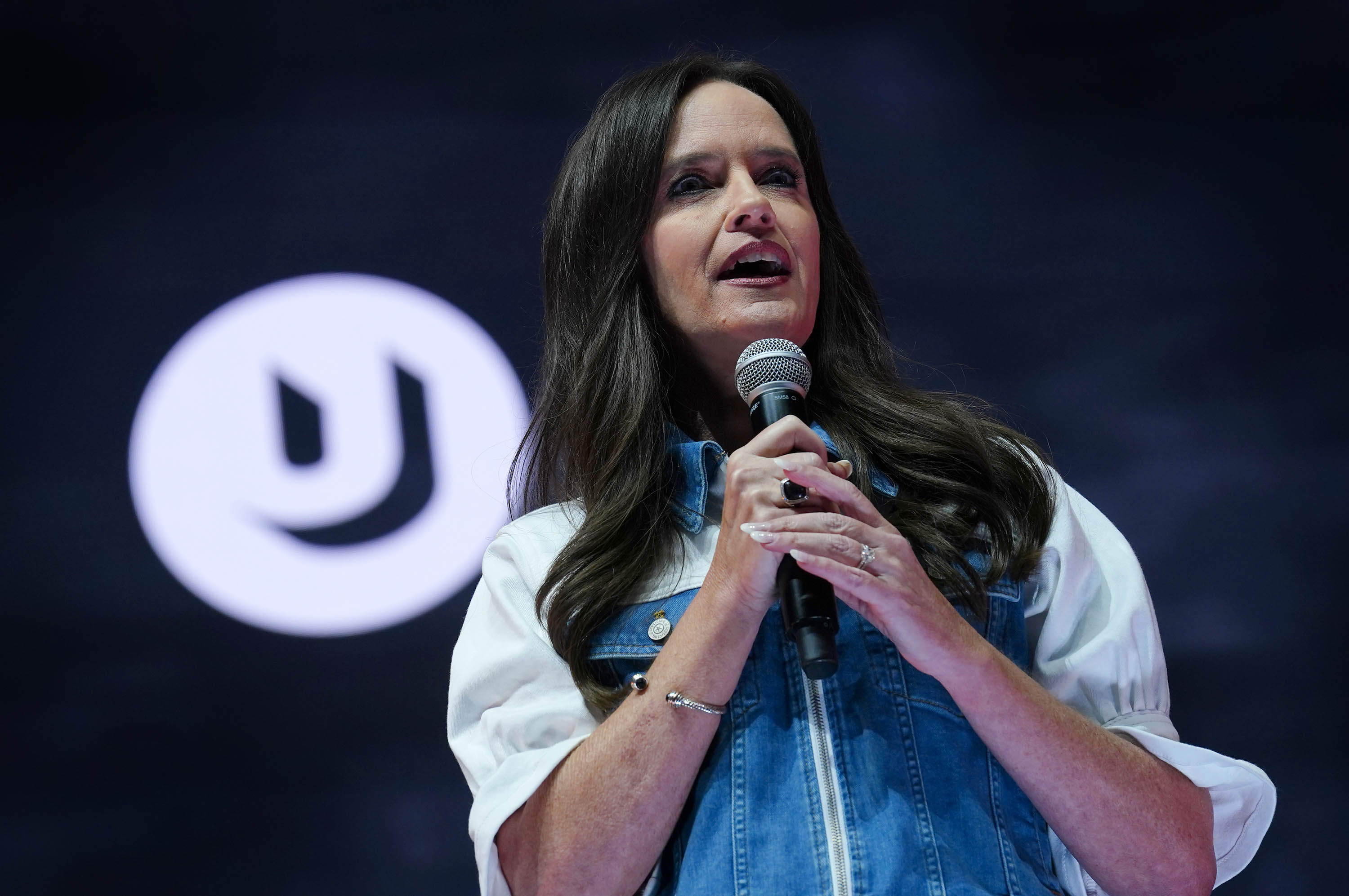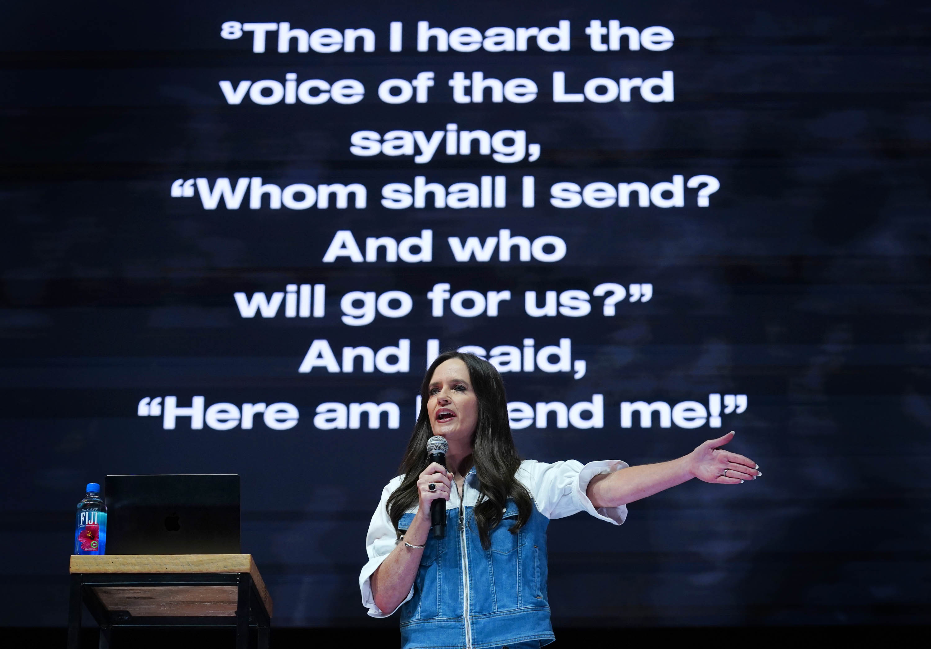 Unite founder Tonya Prewett stresses the importance of praying and obeying during UniteUs GCU at Global Credit Union Arena on Oct. 21, 2025. -