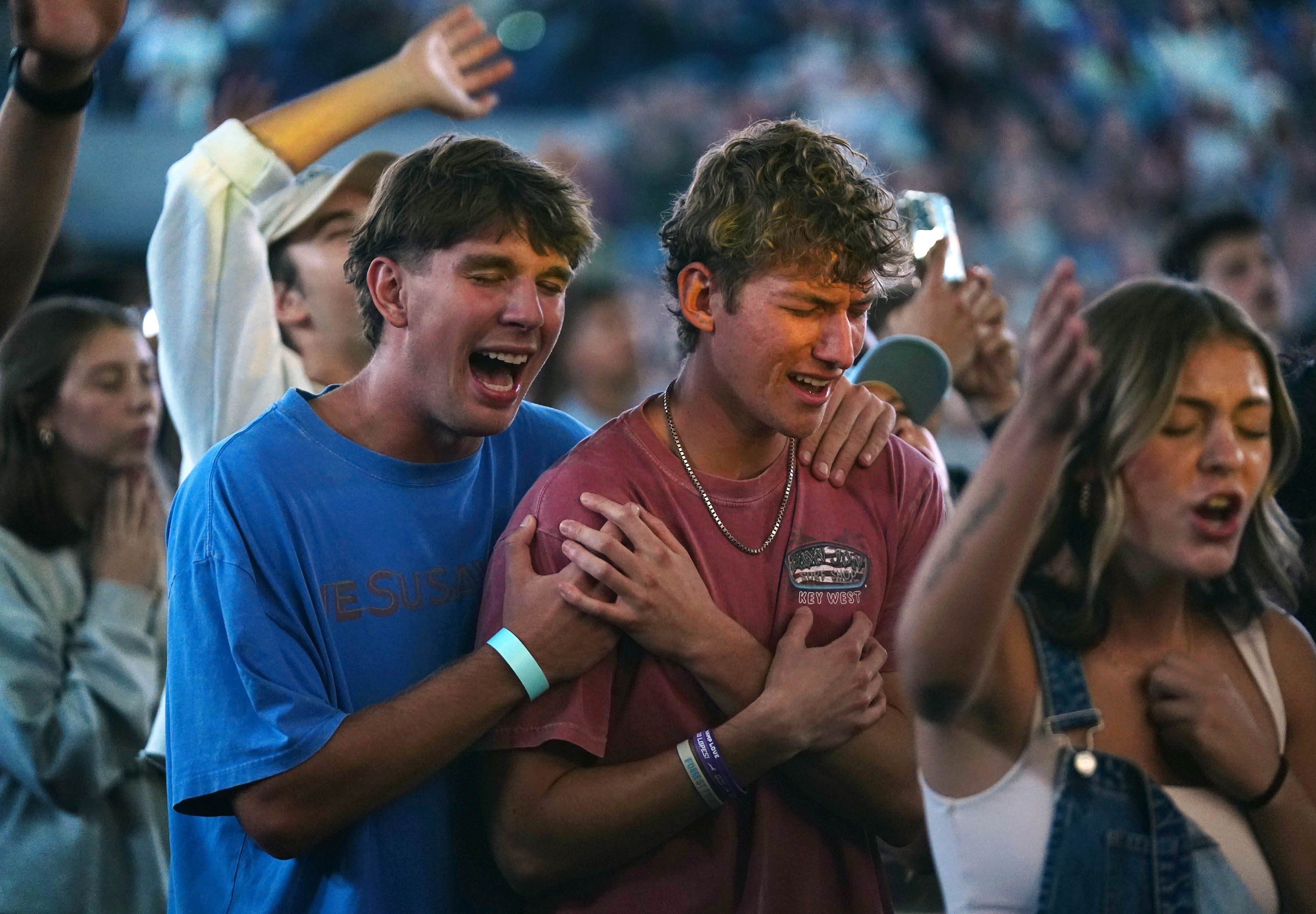 Students embrace as they sing out in praise during UniteUs GCU at Global Credit Union Arena on Oct. 21, 2025. -