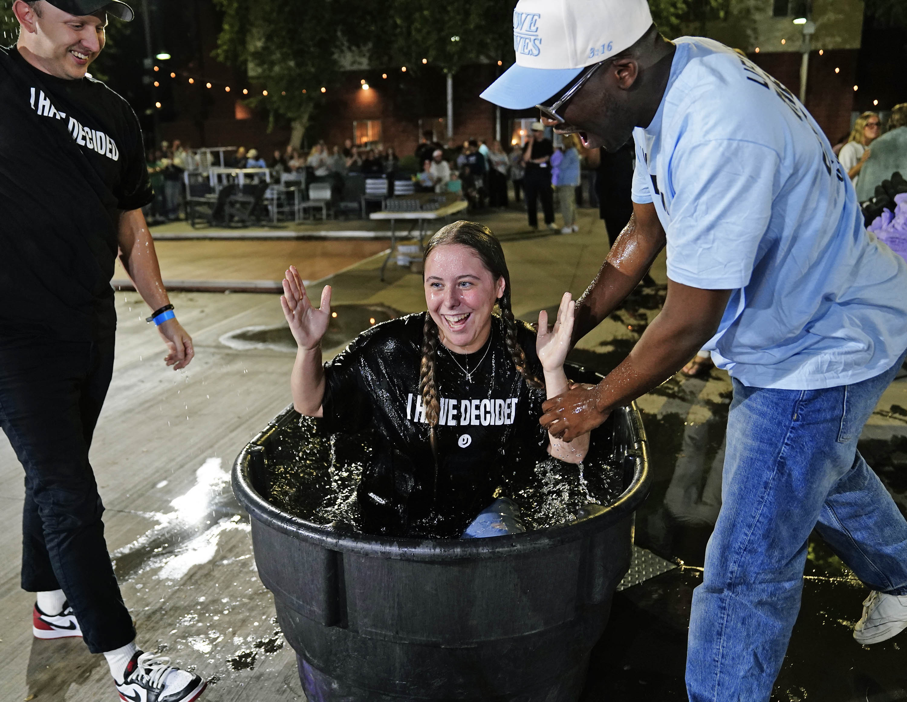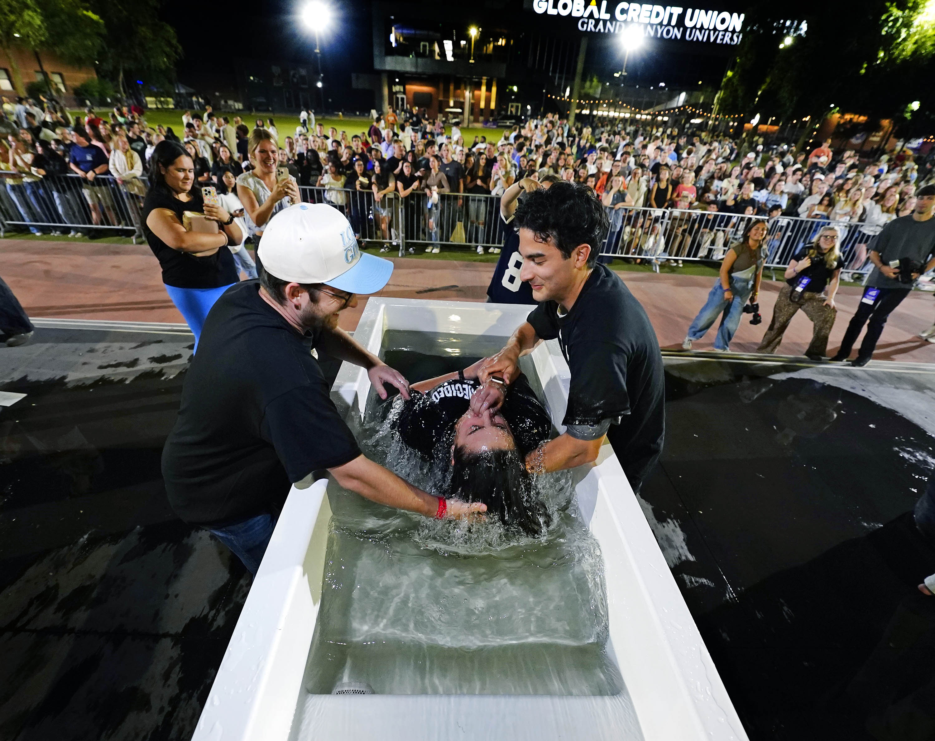 A student gets baptized on the Quad following UniteUs GCU at Global Credit Union Arena on Oct. 21, 2025. -