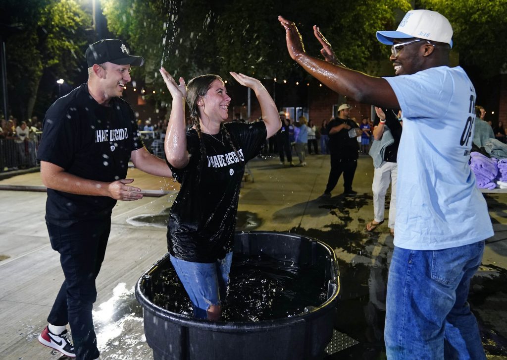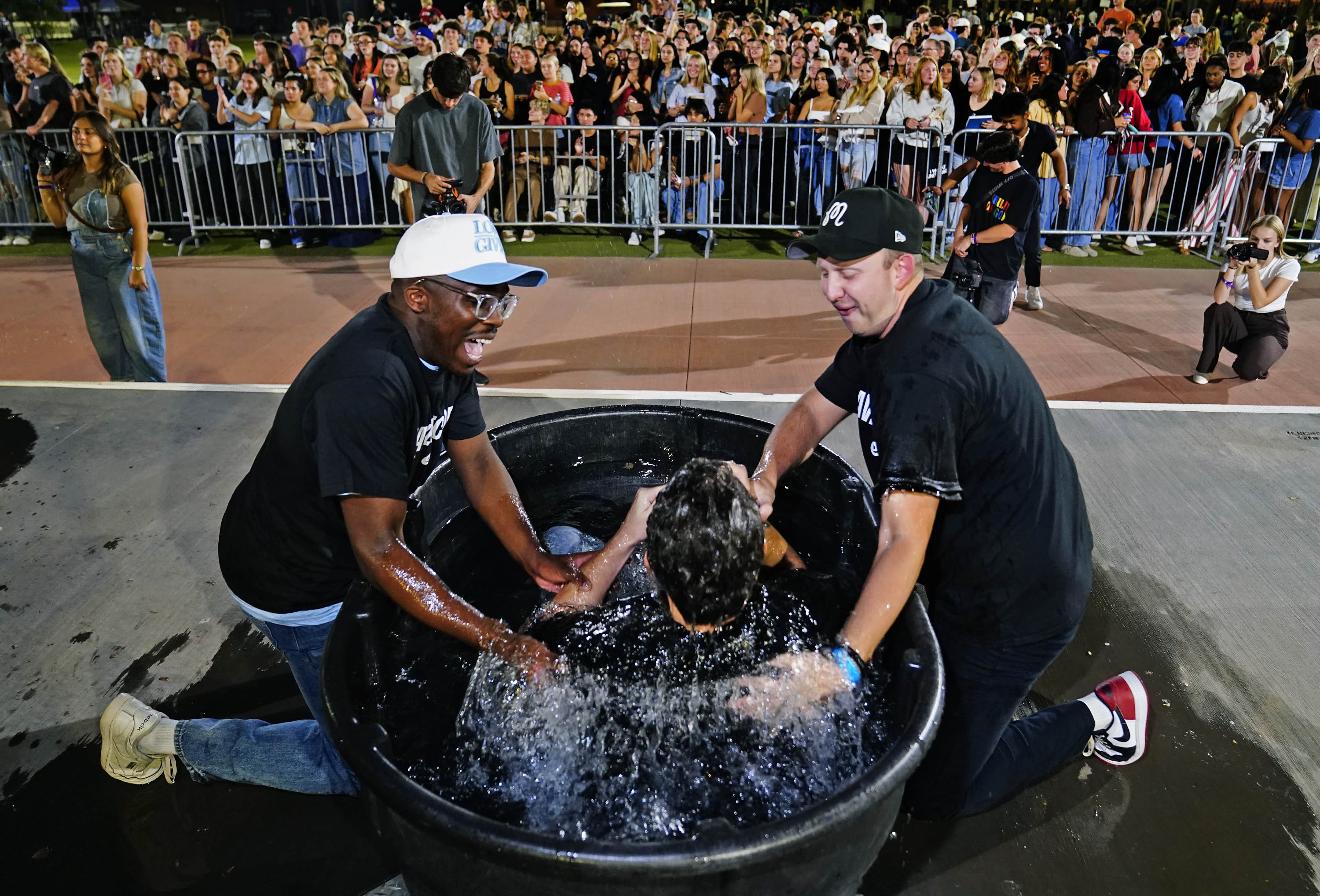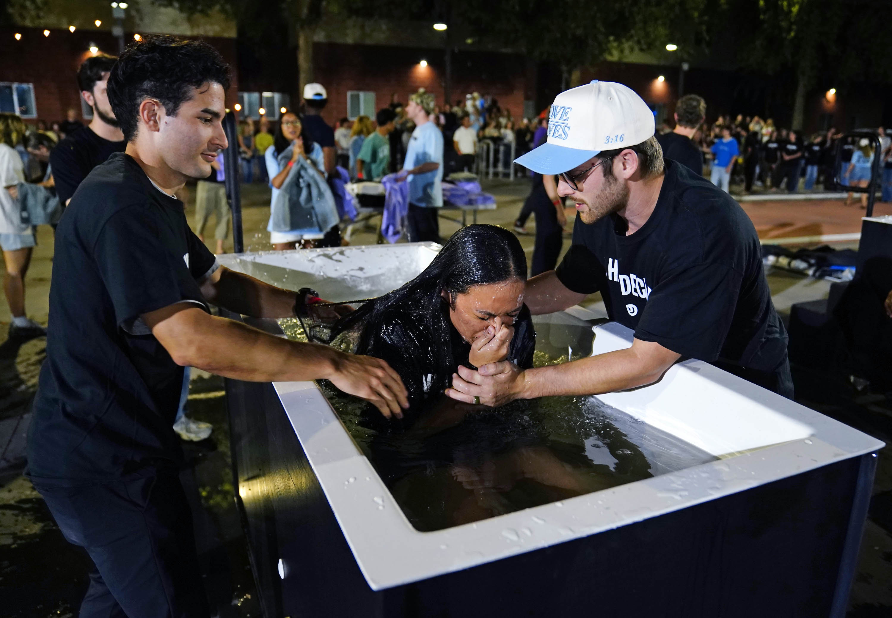 A student get baptized on the Quad following the UniteUs GCU event at Global Credit Union Arena on Oct. 21, 2025. -