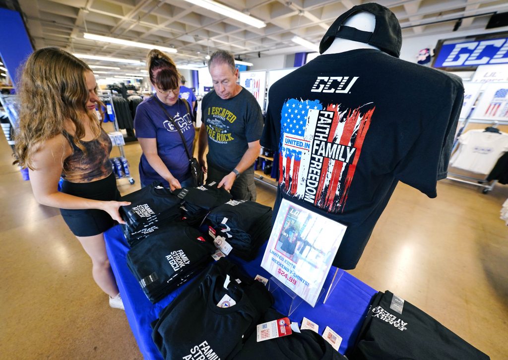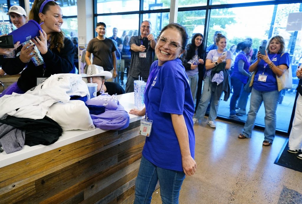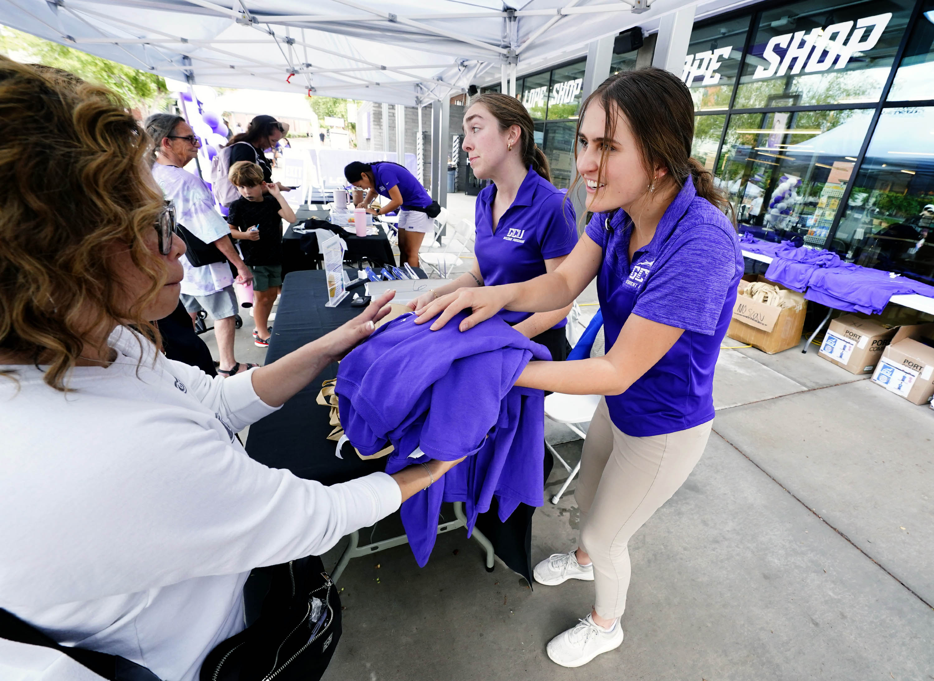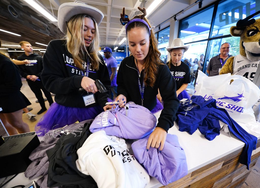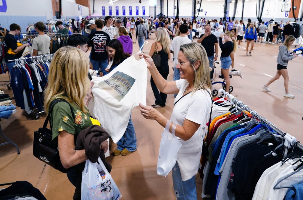 Students and family members look over the limited edition Family Weekend T-shirt at the Lope Shop on Oct. 11, 2025. -