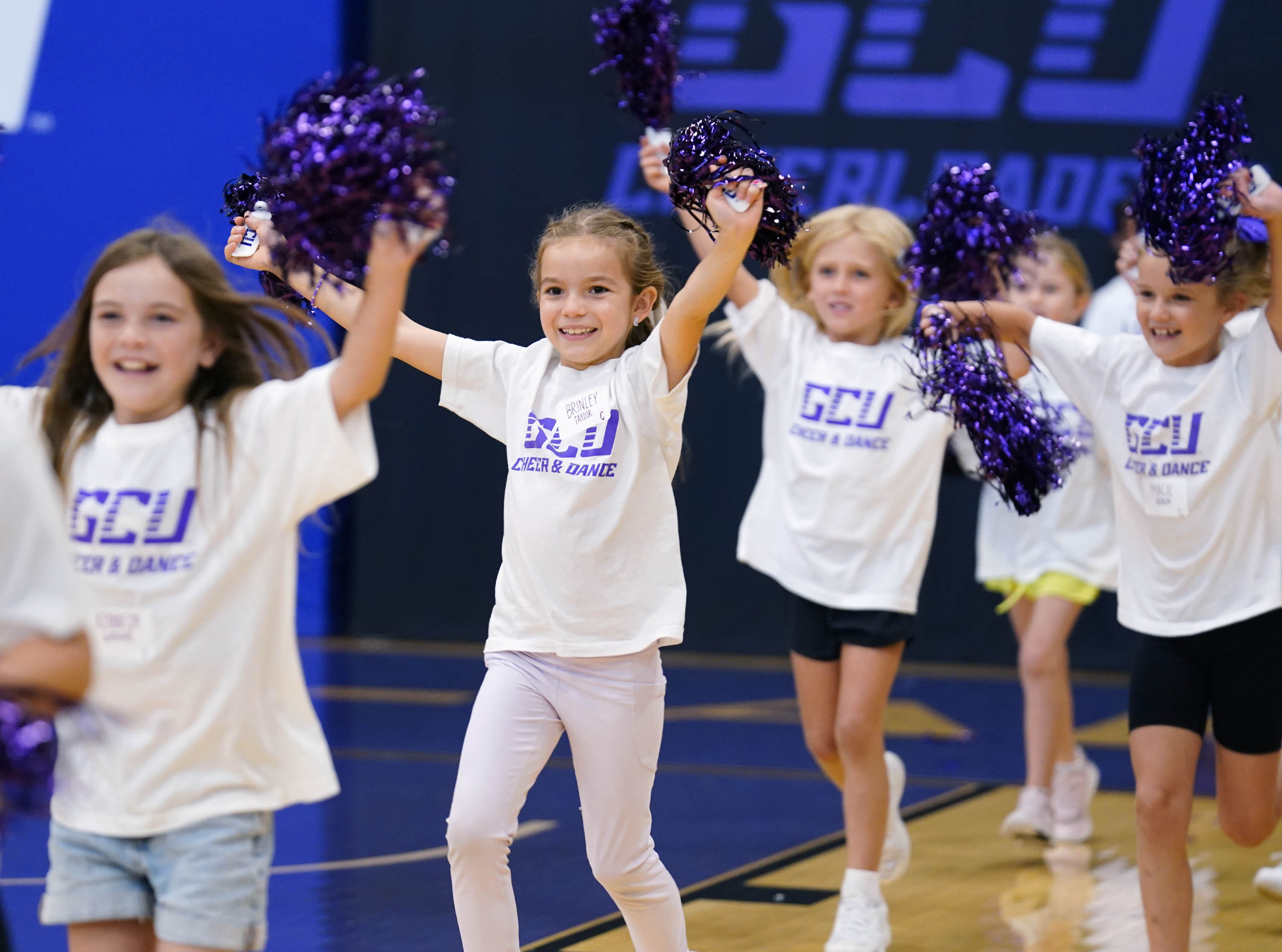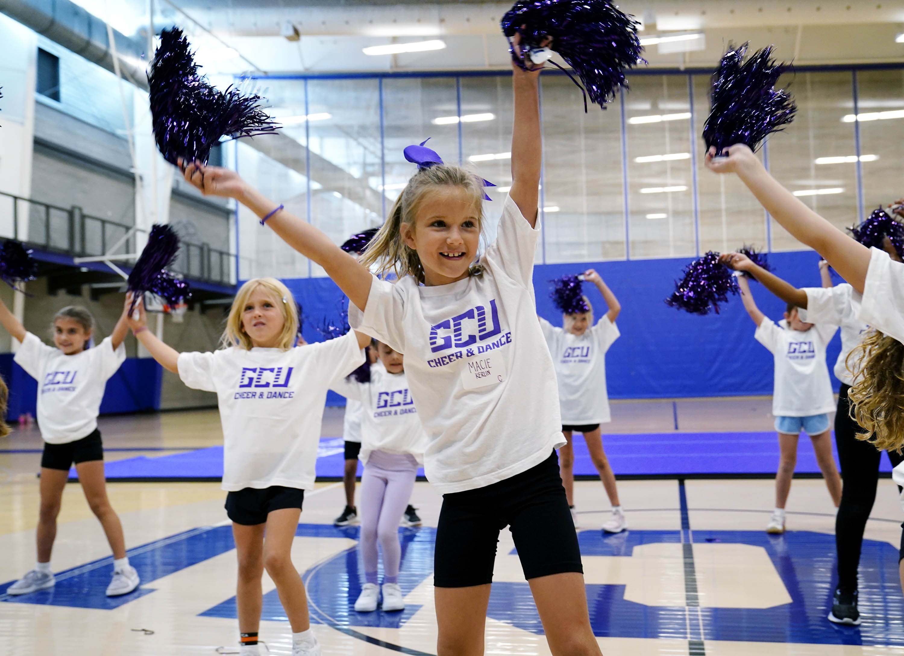 Macie Kerlin and fellow Lil Lopes participants perform a routine for their parents during the GCU Cheer and Dance Clinic at Family Weekend on Oct. 11, 2025. -