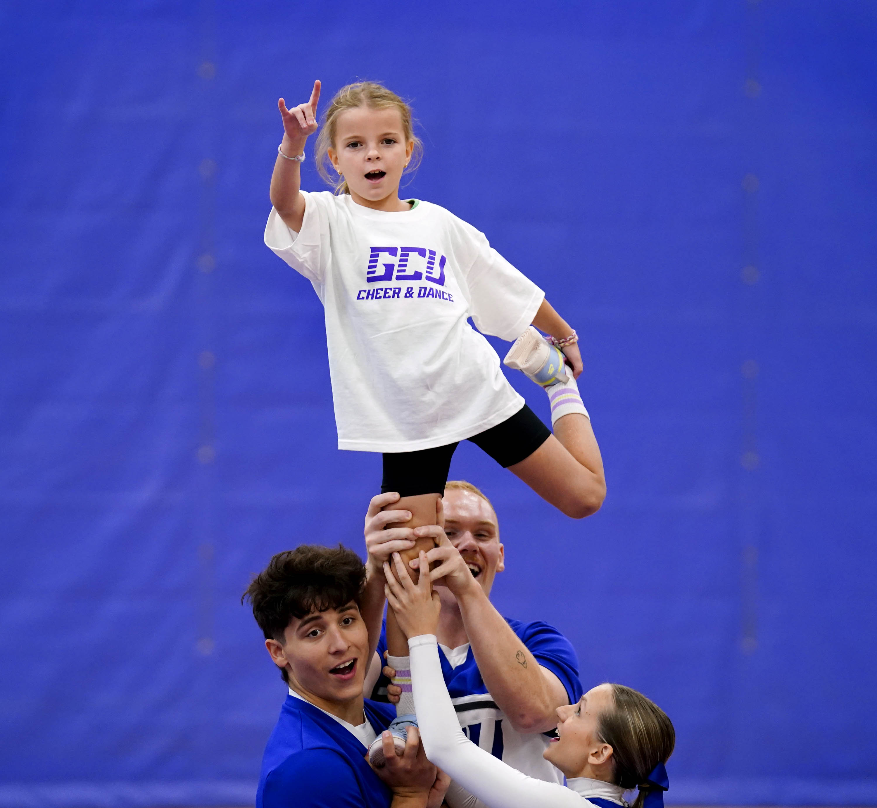 A participant performs a stunt during the GCU Cheer and Dance clinic at Family Weekend on Oct. 11, 2025. -