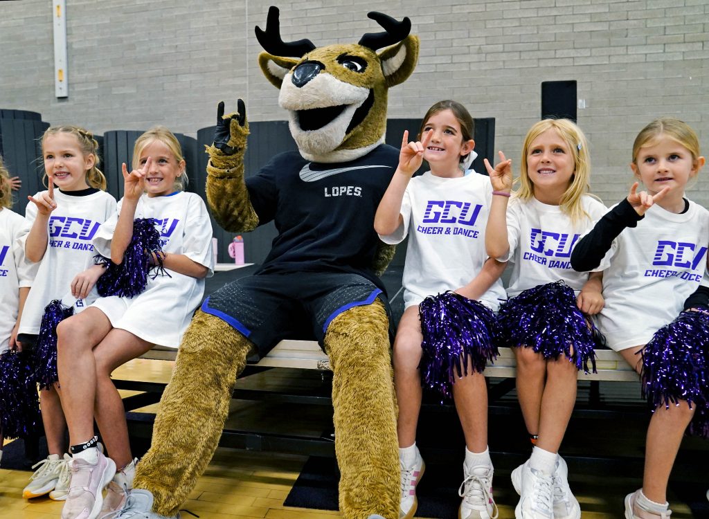 Thunder takes photos with the Lil Lopes participants during the GCU Cheer and Dance clinic at Family Weekend on Oct. 11, 2025. -