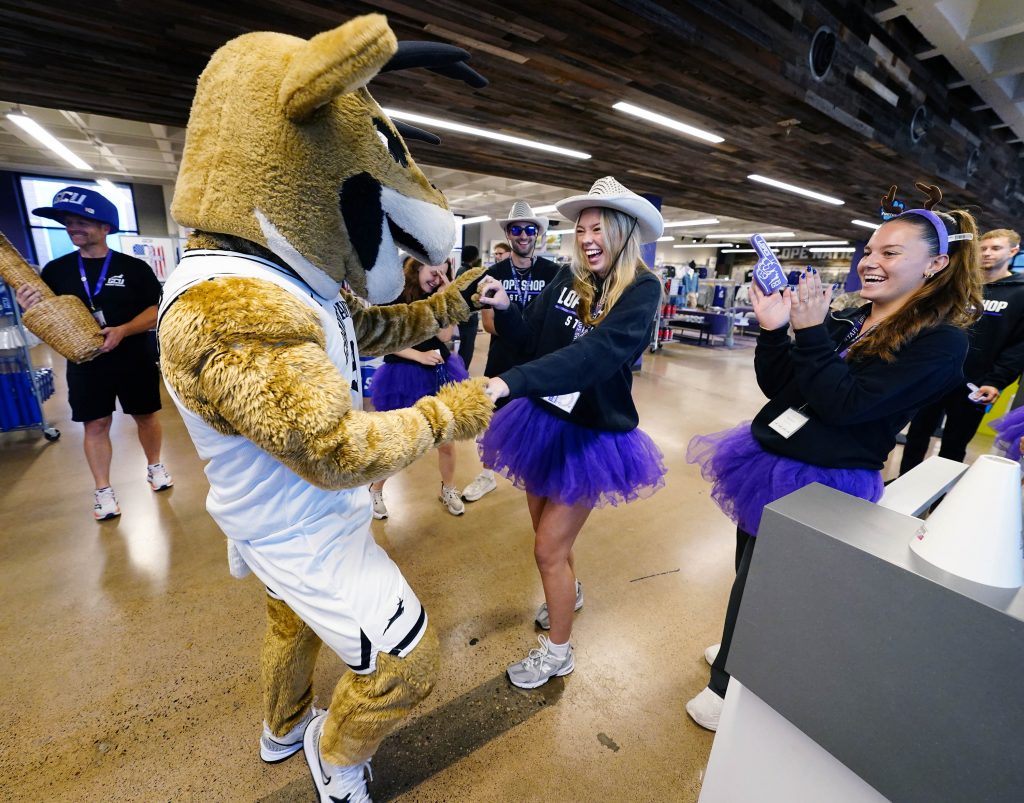 Welcome Programs Manager Garrett Abeyta and Thunder search the crowd for the winner of the Thunderbolt shopping spree event during Family Weekend on Oct. 11, 2025. -