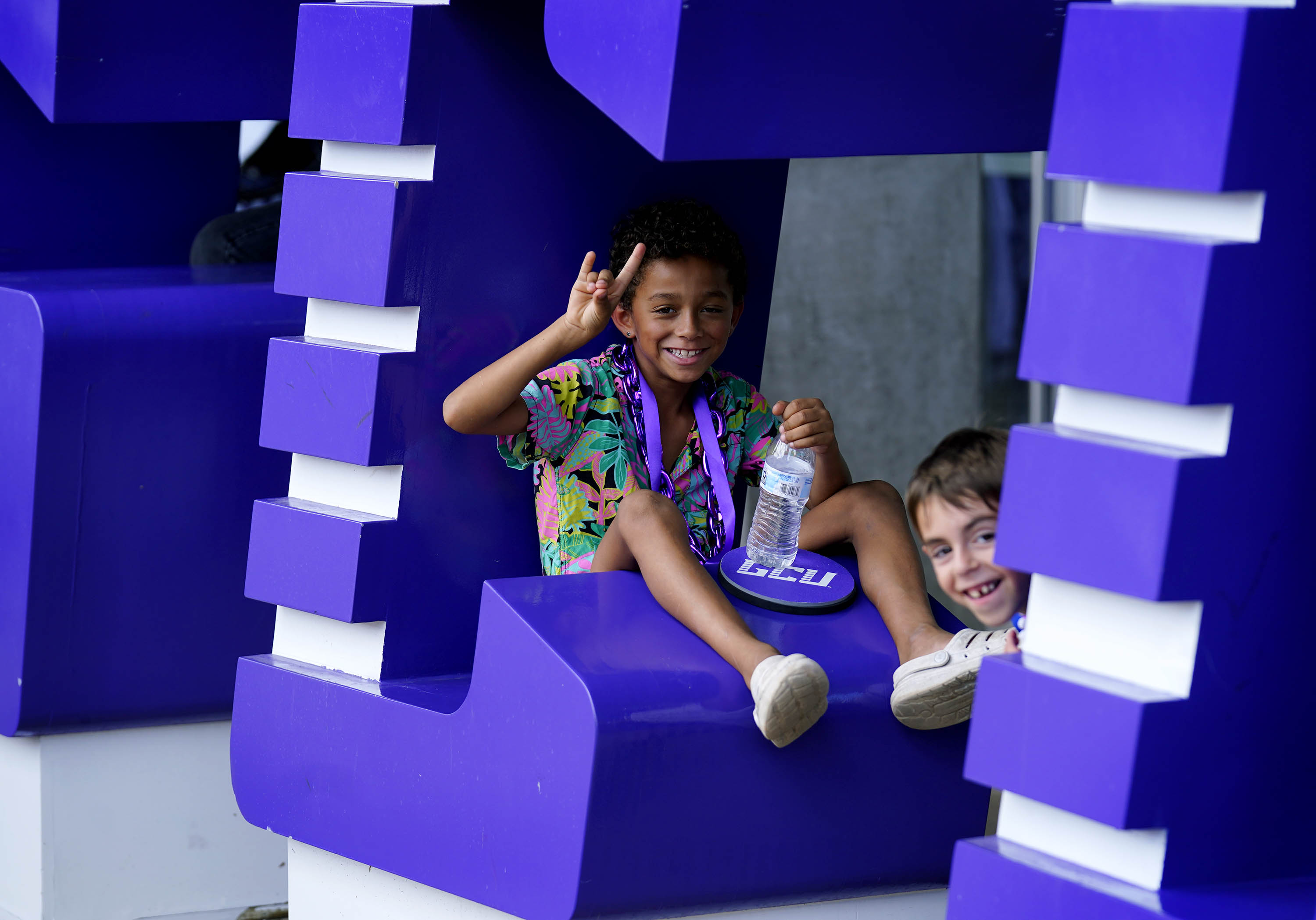 A young Lope finds a comfortable spot in the GCU letters outside Global Credit Union Arena during Family Weekend on Oct. 11, 2025. -