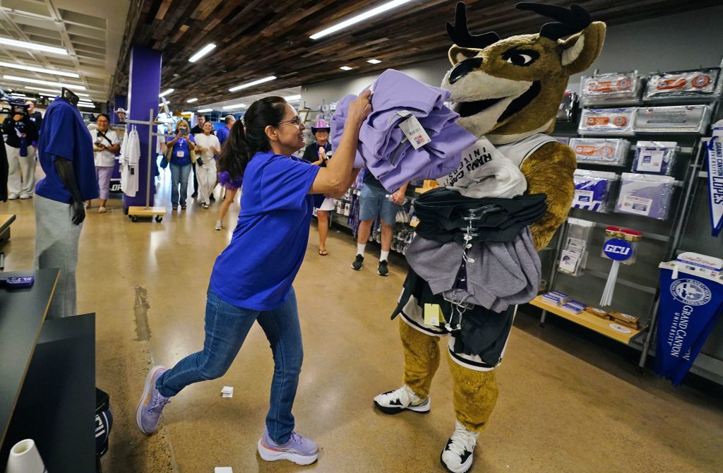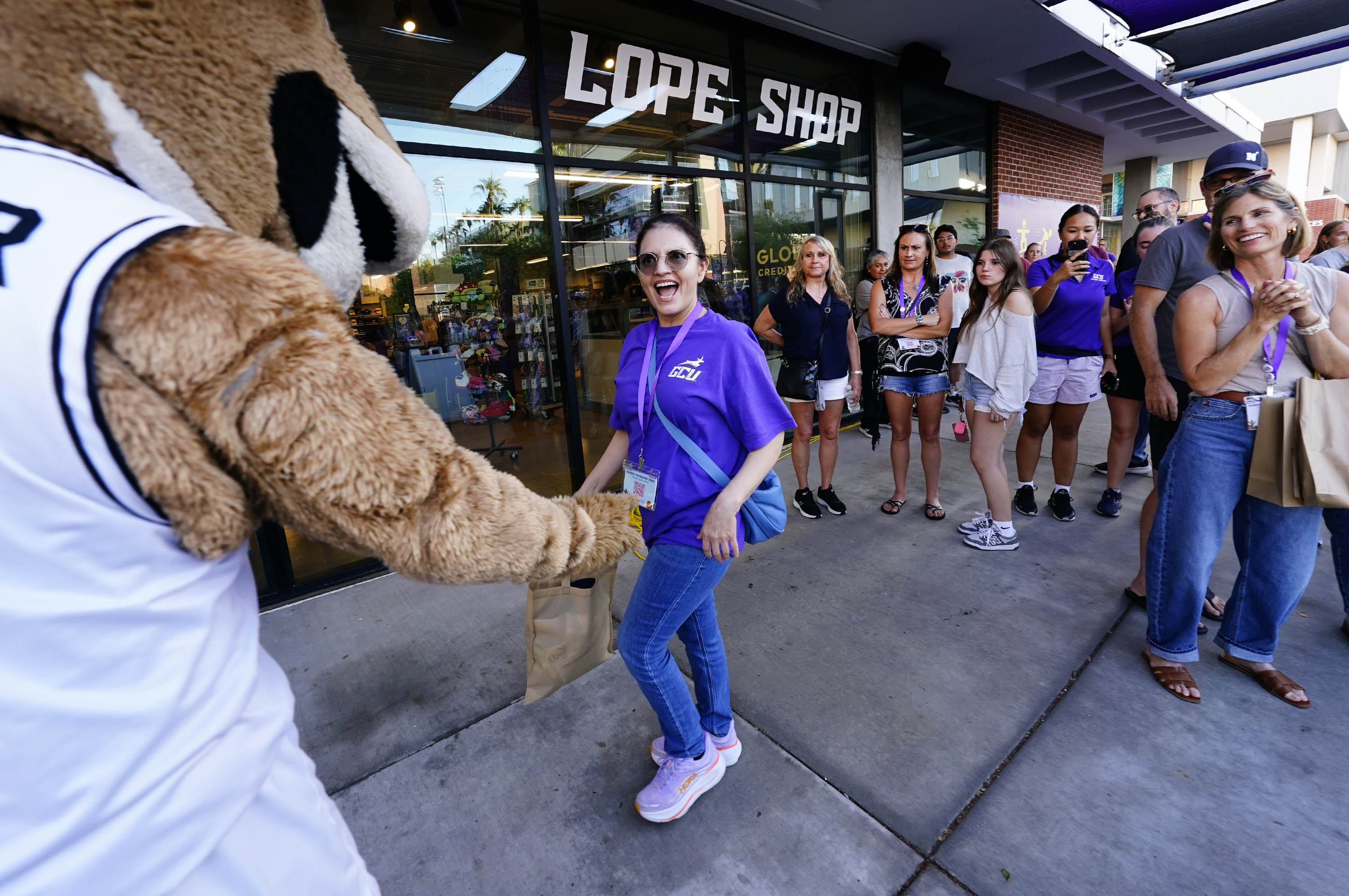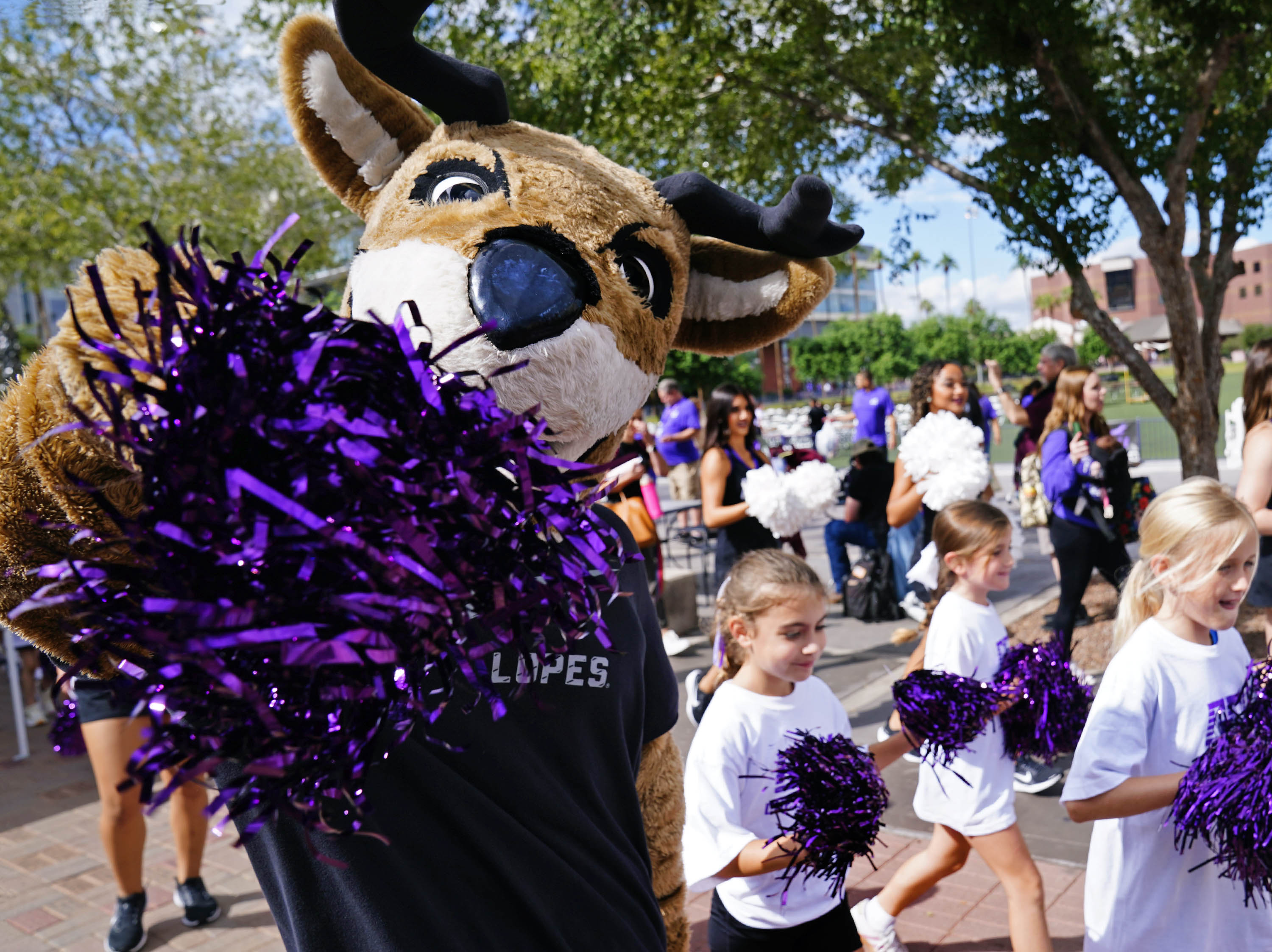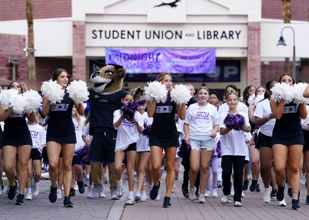 Lil Lopes join the GCU Cheer and Dance teams as they parade down the Promenade to Global Credit Union Arena during Family Weekend on Oct. 11, 2025. -