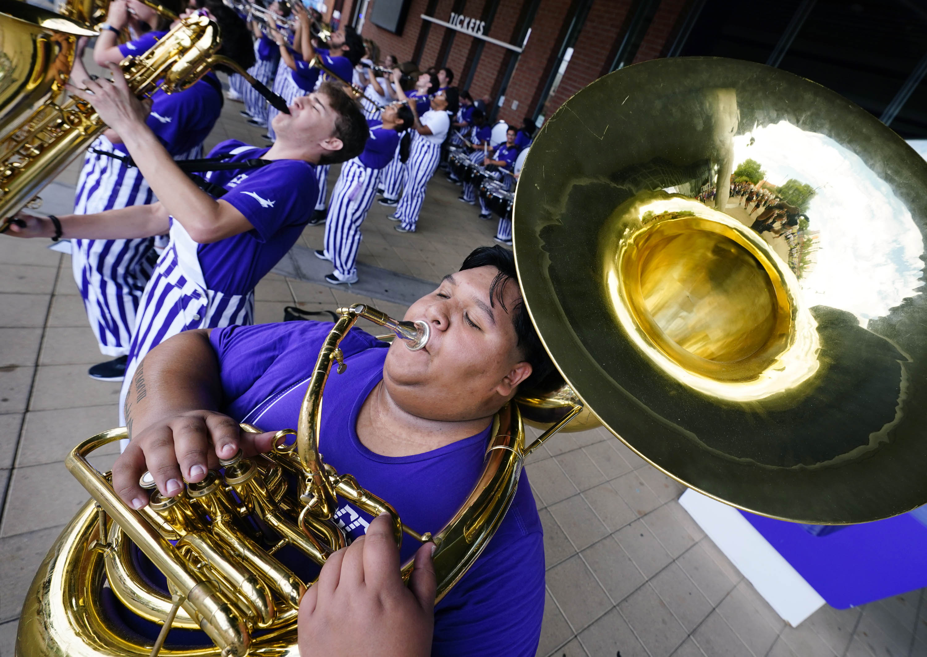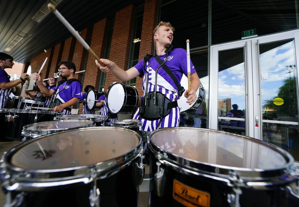 The Thundering Heard Pep Band performs at a mini pep rally in front of Global Credit Union Arena before the women’s volleyball game during Family Weekend on Oct. 11, 2025. -