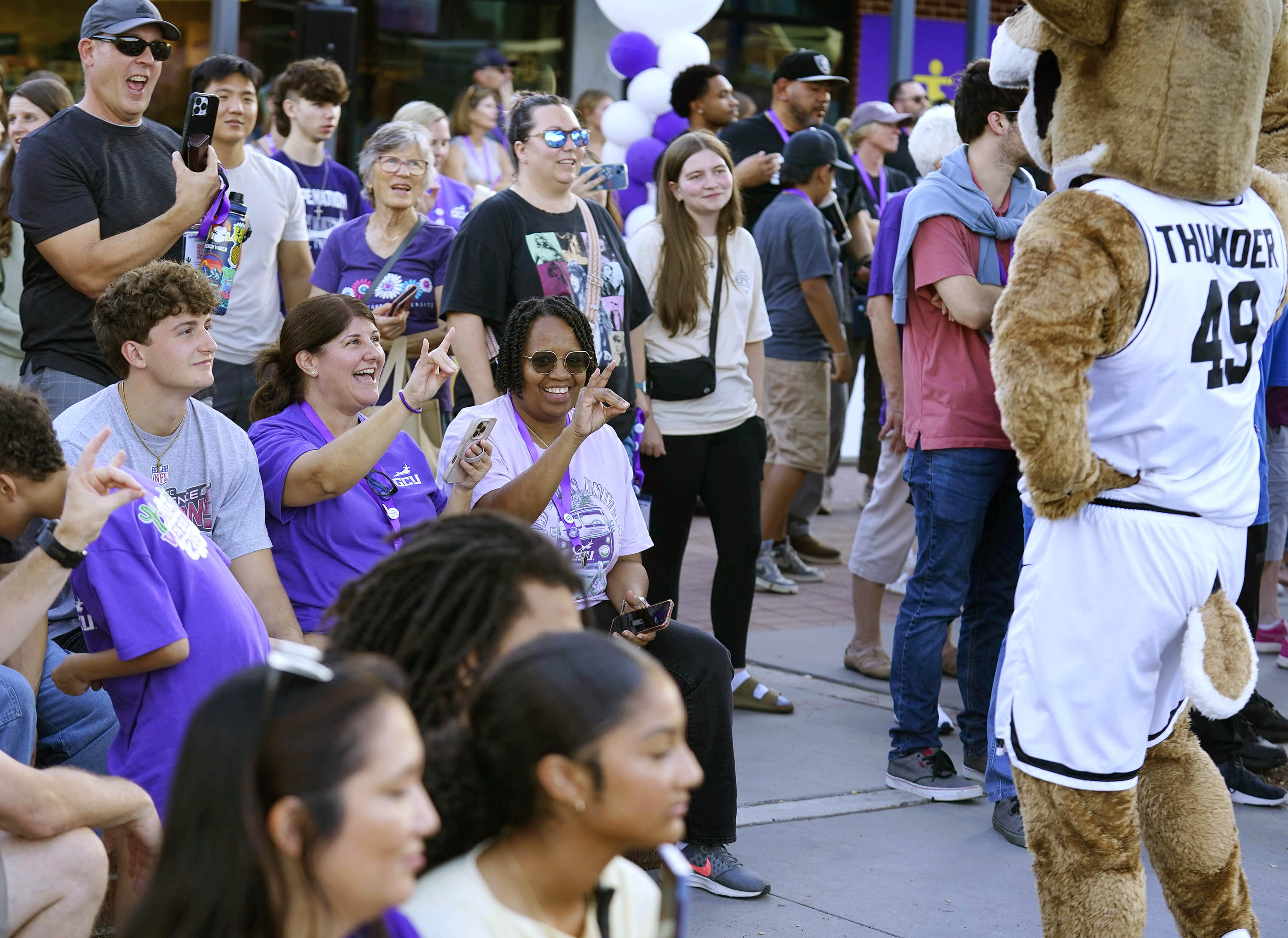 Thunder works the crowd in front of the Lope Shop before the Thunderbolt event at Family Weekend on Oct. 11, 2025. -